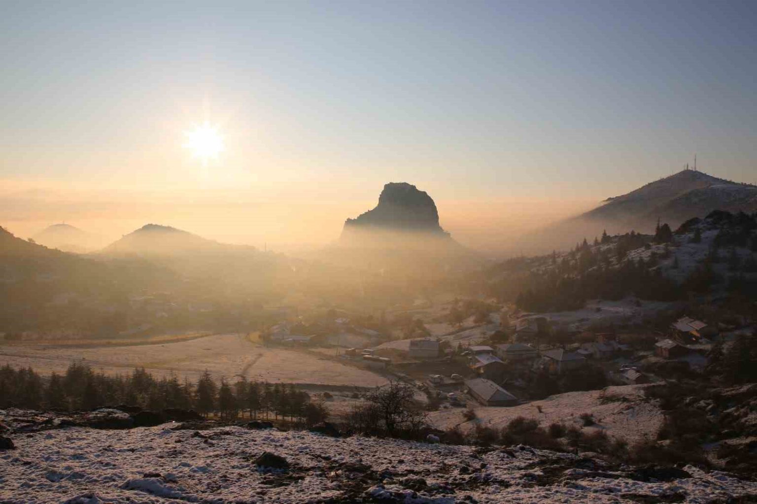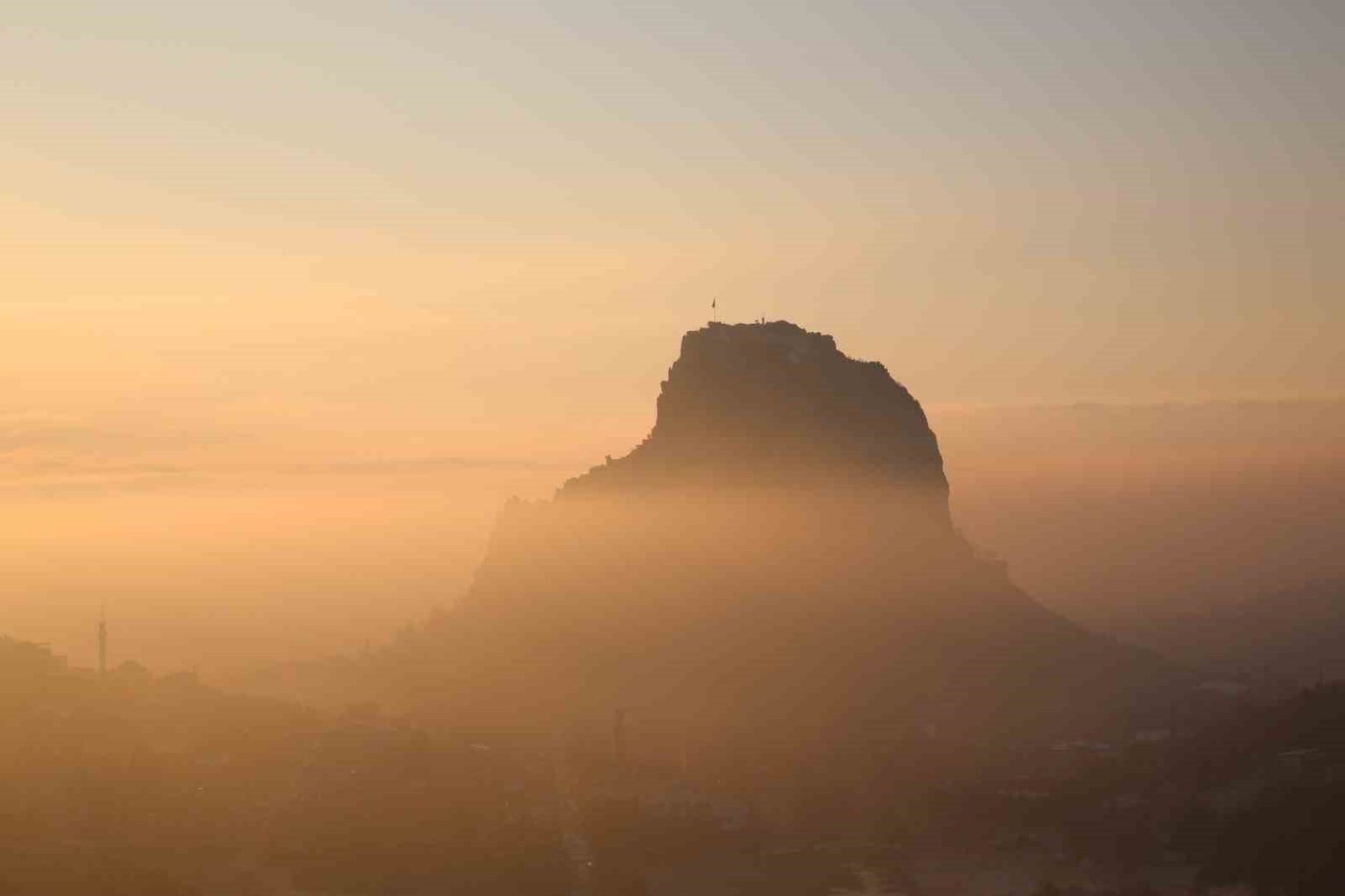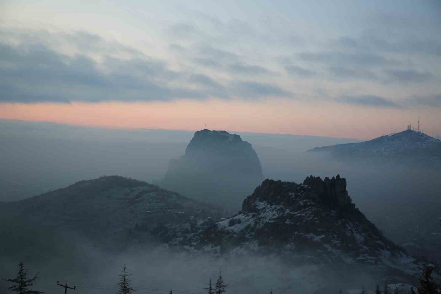 Afyonkarahisar’ın simgesi tarihi Karahisar Kalesi’nin gün doğumu ile birlikte çekilen sis altındaki görüntüsü görenleri kendisine hayran bıraktı.