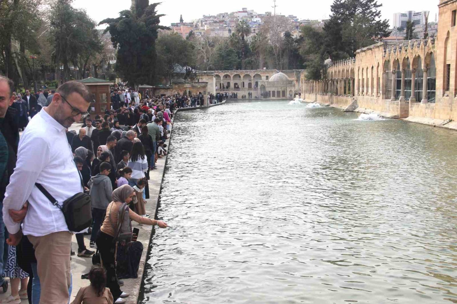 Termometrenin 20 dereceyi gösterdiği Şanlıurfa’da hafta sonu tatilini fırsat bilenler, “dünyanın en büyük doğal akvaryumu” olarak bilinen ve inanç turizminde önemli yere sahip Balıklıgöl’ü ziyaret etti. Kentin simgesi konumundaki yerleşkede balıklara yem atan ziyaretçiler, hatıra fotoğrafı da çektirdi. Geçtiğimiz günlerde kentte etkili olan sağanak nedeniyle suyu bulanık hale gelen ve rengi değişen Balıklıgöl’ün tahliye ve arıtma çalışmalarının ardından eski haline döndüğü görüldü.