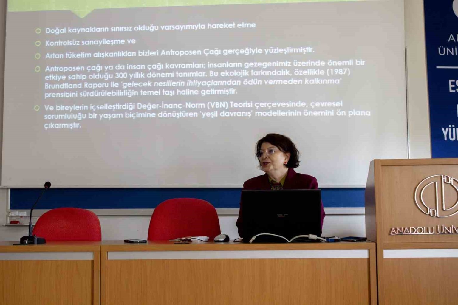 Anadolu Üniversitesindeki seminerde konuşan Doç. Dr. Nuran Öztürk Başpınar, bireylerin çevre dostu niyetlerine rağmen alışkanlıklarından vazgeçemediklerini belirterek, gerçek bir değişim için geri dönüşümden fazlasının; yani kültürel bir dönüşümün şart olduğunu vurguladı.