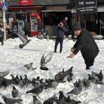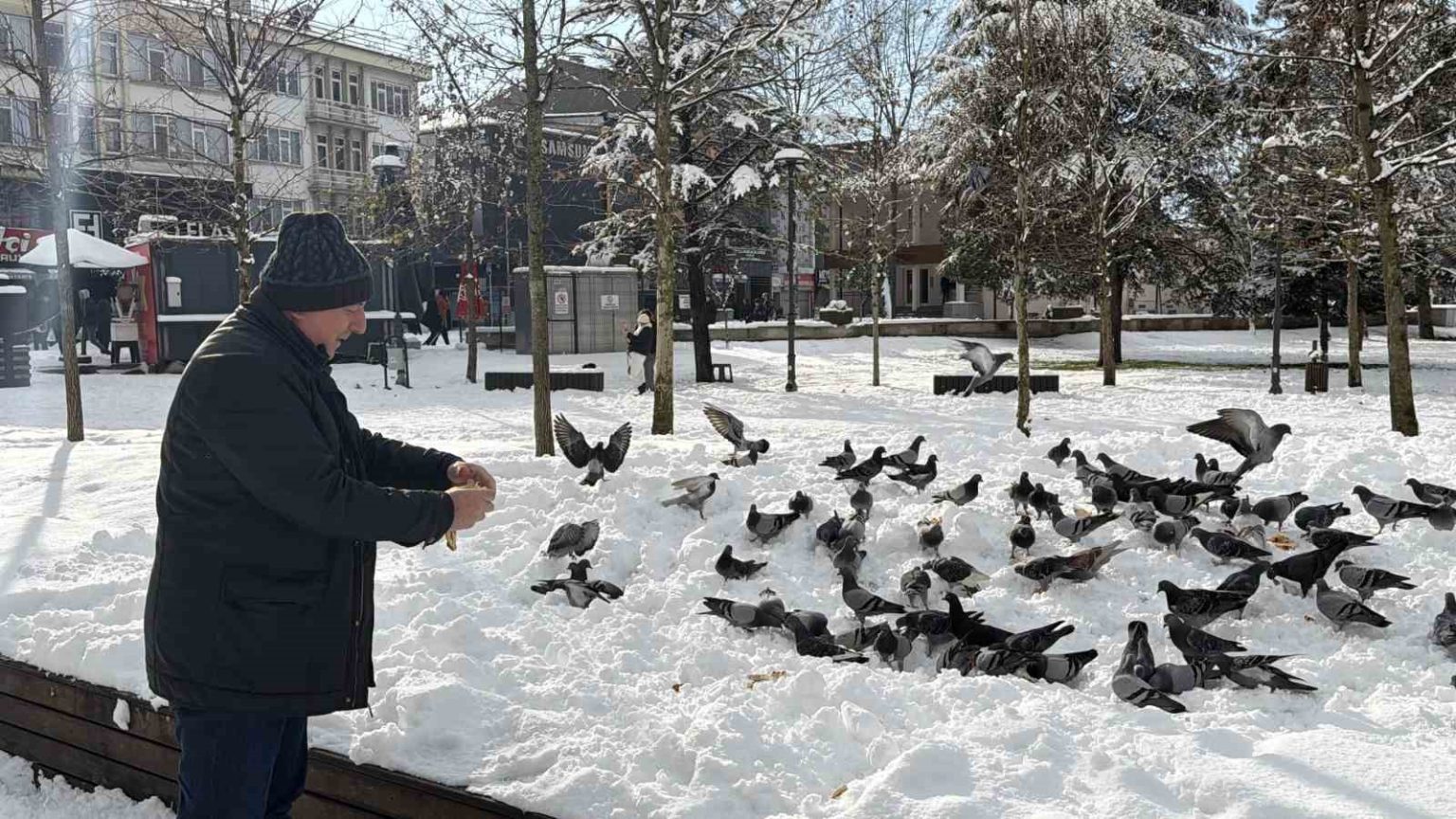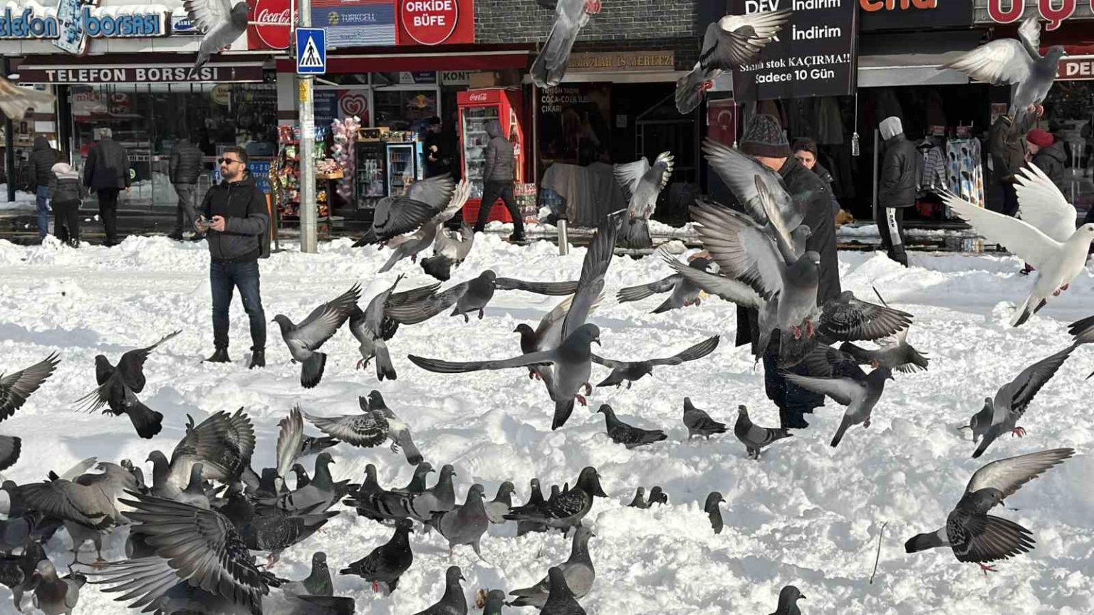 Düzce’de kar nedeniyle yemek bulmakta zorlanan güvercinleri besleyen Vedat Öztürk’ün görüntüleri yürekleri ısıttı. Düzce, 2026 yılının ilk gününe beyaz örtüyle uyandı. Yüksek kesimlerde 70 santimetreye ulaşan şehir merkezinde 15 santimetreyi buldu. Kar nedeniyle yemek bulamayan güvercinlerin imdadına vatandaşlar yetişti. Millet bahçesinde güvercinleri besleyen Vedat Öztürk’ün görüntüleri yürekleri ısıttı. Konuya ilişkin gazetecilere açıklama yapan Öztürk, “Vesile olmuşsak ne mutlu bize. Kışın karda tabii hayvanlar da acıkmıştır. Biz de yardımcı olmak istedik, inşallah karınları doymuştur” ifadelerine yer verdi.