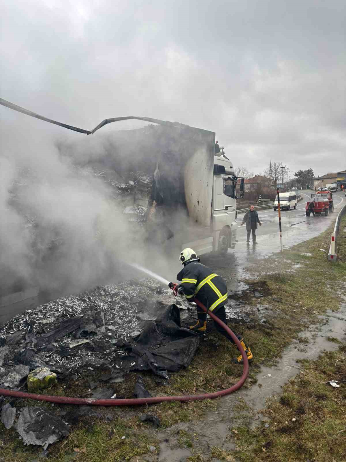 Edinilen bilgilere göre olay, ilçeye bağlı İslambey köyü mevkiinde meydana geldi. İğneada’dan yüklediği hamsileri İstanbul’a götürmek üzere yola çıkan 51 KV 160 plakalı tırın sürücüsü, seyir halindeyken lastik kısmından duman çıktığını fark etti. Aracı yol kenarına çeken sürücü, itfaiye ekiplerine haber verdi.