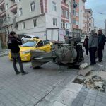 Tekirdağ’ın Çorlu ilçesinde ticari taksinin yol verdiği panelvan minibüsün arkasında takılı harç karma makinesi, taksinin üzerine devrildi. Taksi şoförü kazayı hafif sıyrıklarla atlattı.