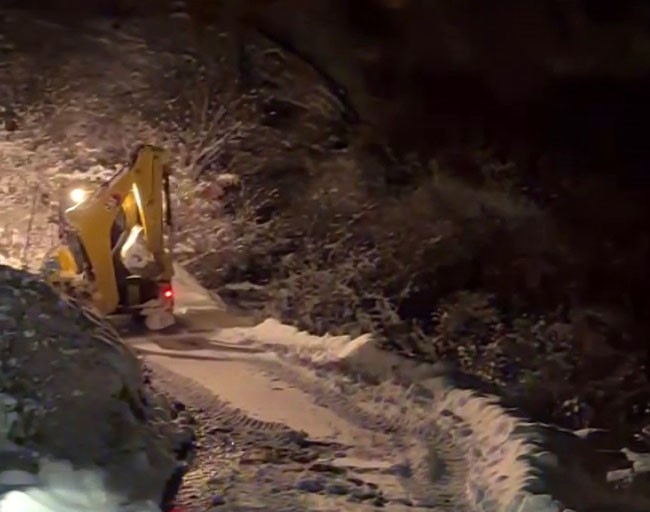 Kar yağışının yer yer yarım metreyi geçtiği yüksek kesimlerde, bir taraftan karla mücadele sürerken diğer taraftan ambulansların hastalara ulaşmasına yardımcı olunuyor. Yolda kalan araçlar iş makineleriyle çekiliyor.