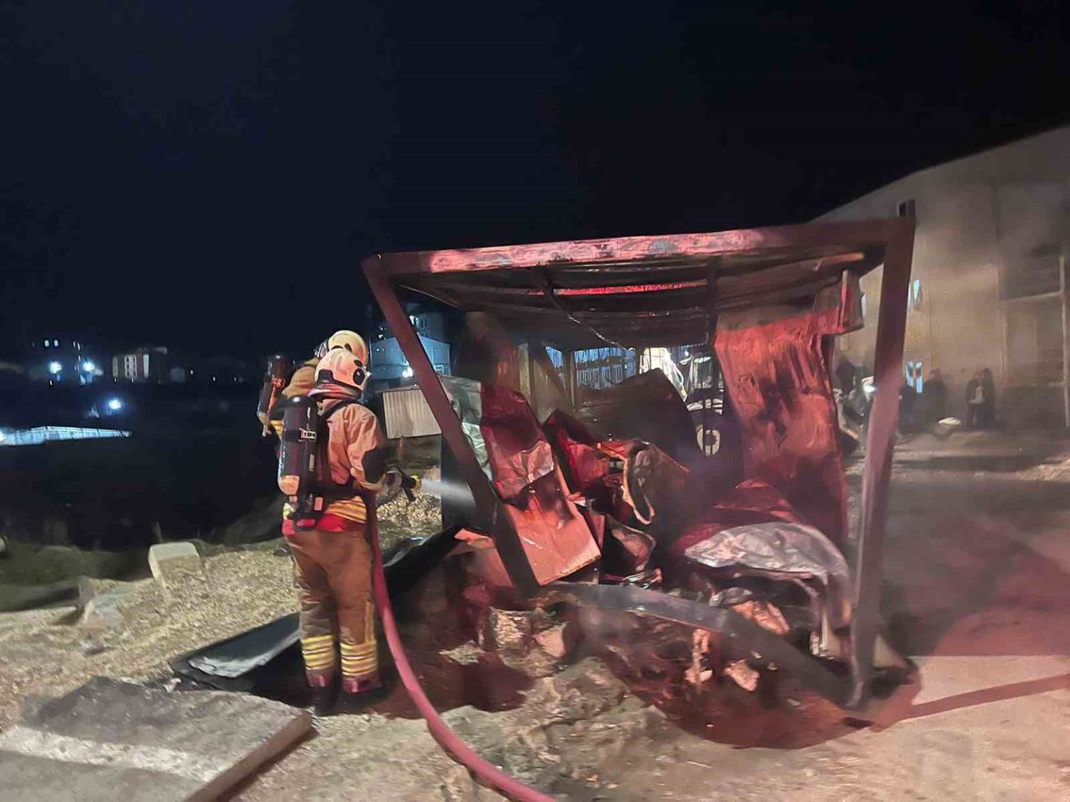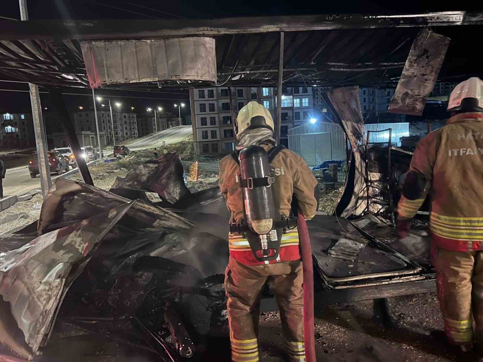 Hatay’da alevlere teslim olarak yanan şantiye alanındaki konteyner kullanılmaz hale geldi.