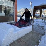 Karabük’ün Safranbolu ilçesinde bir esnaf, kar yağışını fırsata çevirerek dükkanının önüne kardan yatak yaptı.