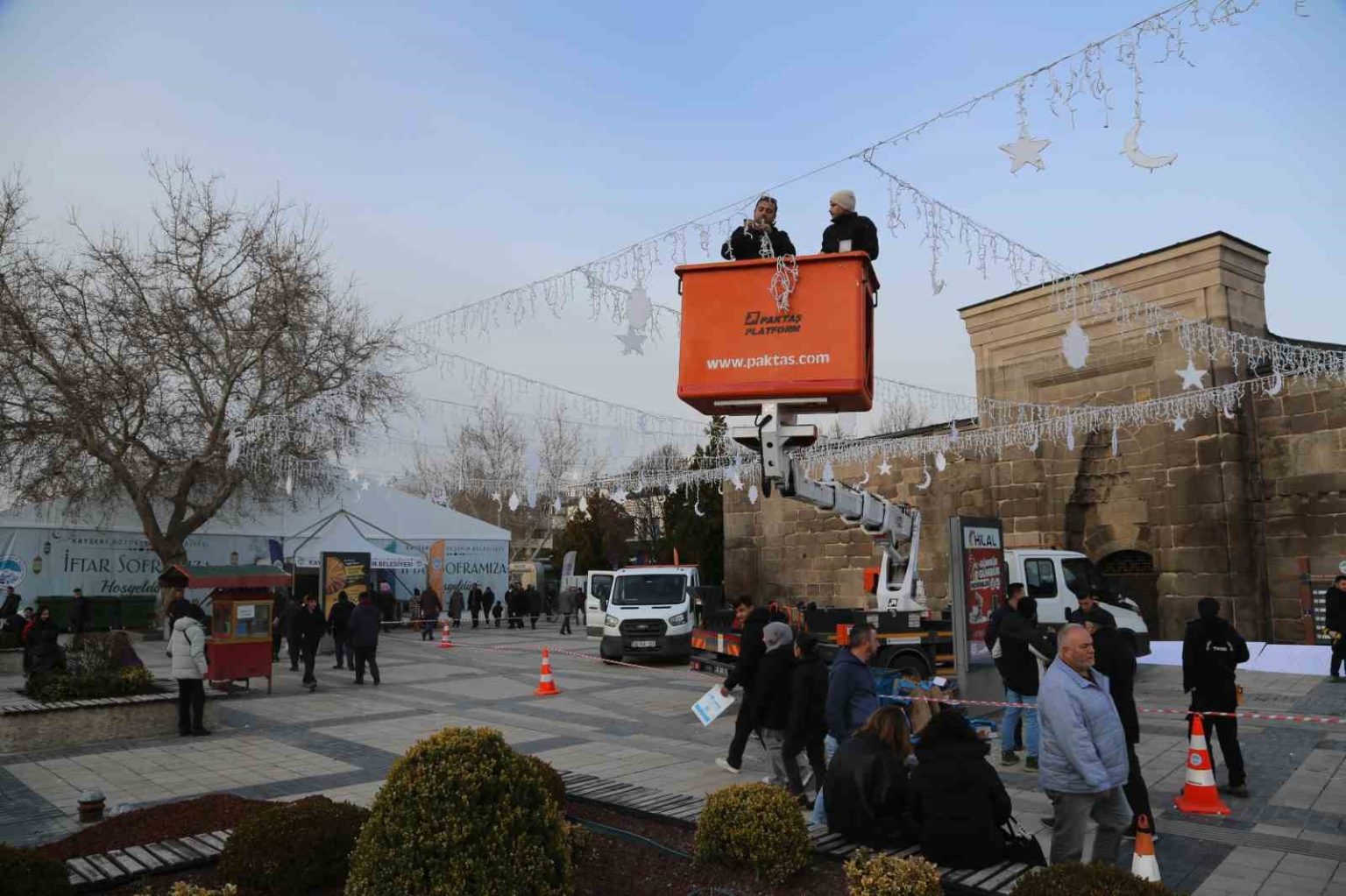 Ramazan boyunca yoğun ilgi gören iftar çadırının bulunduğu Hunat Hatun Camii önü, gerçekleştirilen estetik dokunuşlarla hem görsel açıdan zenginleşti hem de vatandaşların manevi atmosferi daha derinden hissettiği bir buluşma noktası haline geldi. Kurulan dekoratif ışıklandırmalar, akşam saatlerinde bölgeye ayrı bir güzellik katarken, Ramazan’ın huzurunu ve ruhunu yansıtan bir ortam oluşturuyor.