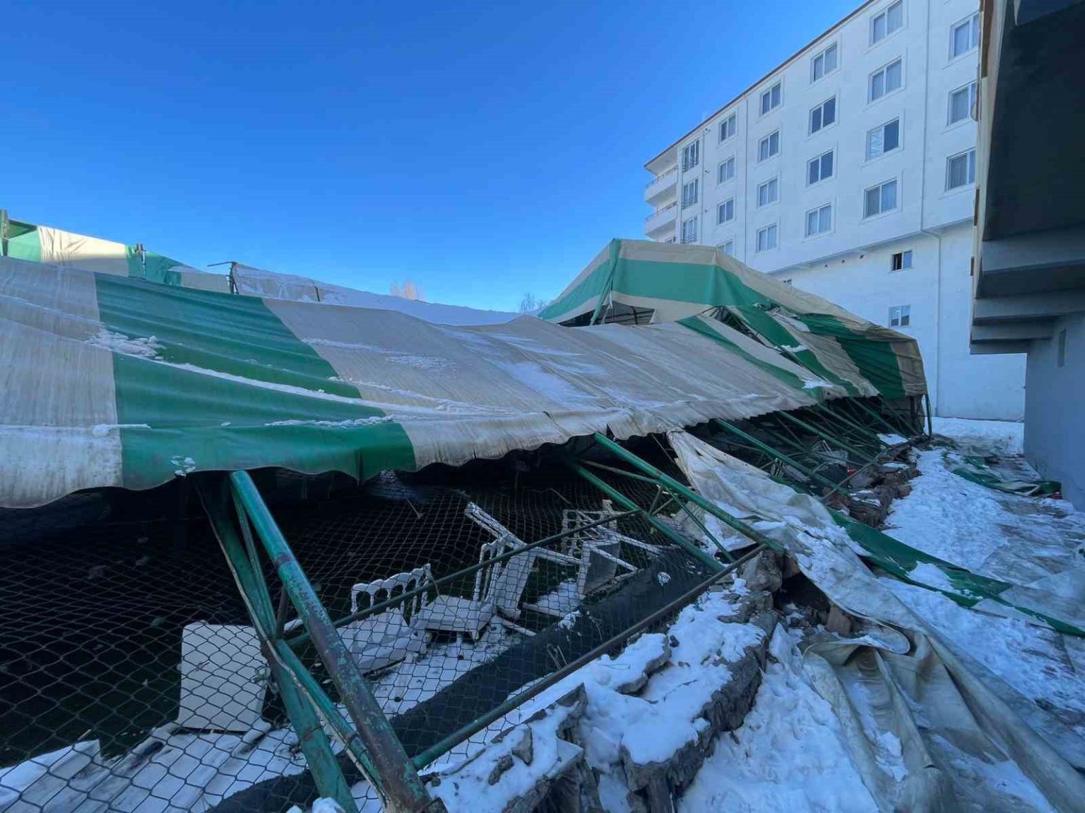 Tuzluca ilçesinde yaklaşık bir yıldır düğün salonu olarak kullanılan halı saha, günlerdir süren yoğun kar yağışının ardından çöktü. Olay meydana geldiği sırada halı sahada kimsenin bulunmaması muhtemel bir faciayı önledi. Çökme sonrası yapıda hasar oluştu.