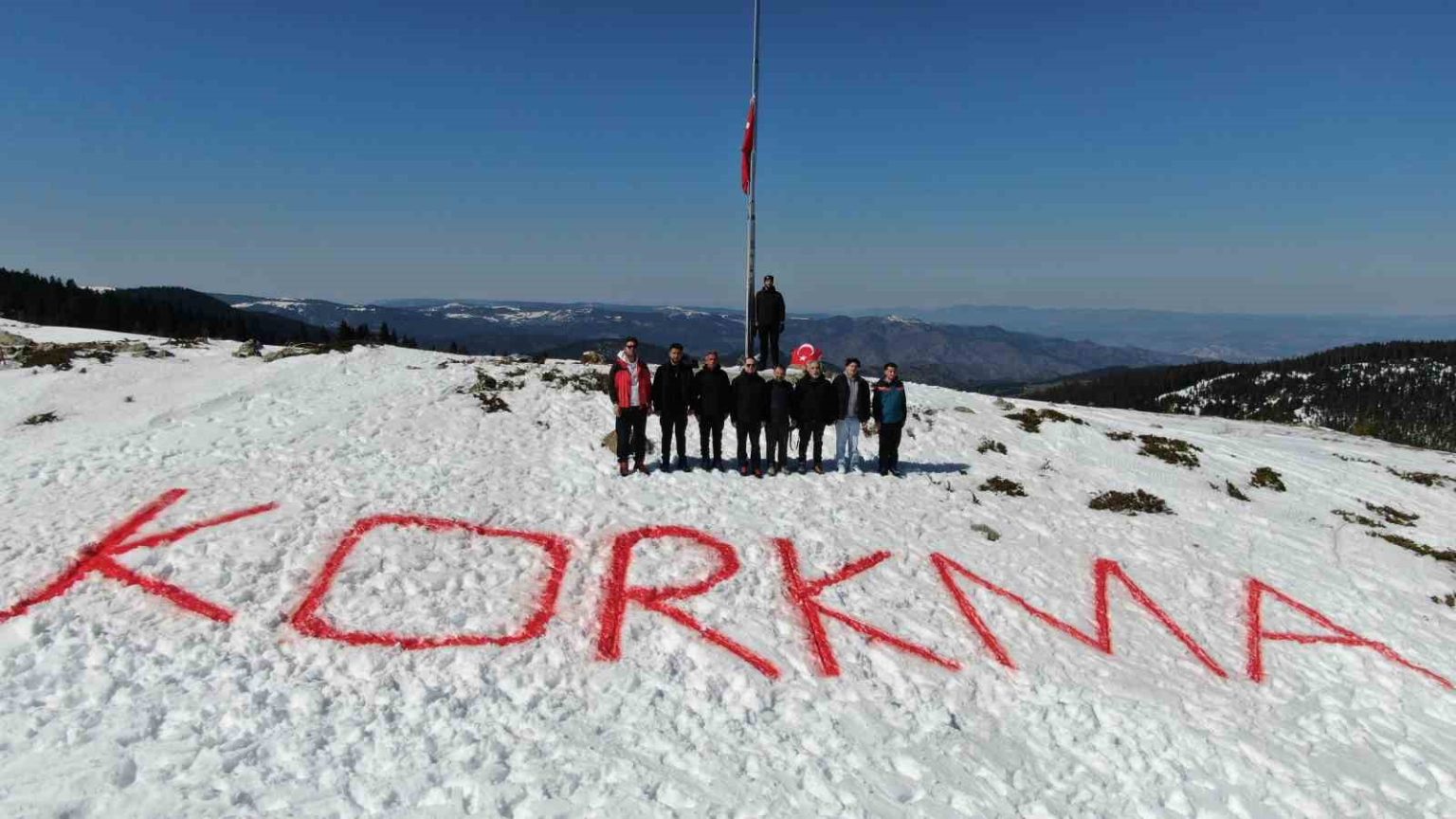 İstiklal Marşı’nın kabulünün 105. yıl dönümü etkinlikleri çerçevesinde, 2 bin 200 rakımlı Ilgaz Dağı’nın zirvesinde kara kırmızı boyayla İstiklal Marşı’nın ilk kelimesi olan ‘korkma’ yazıldı.