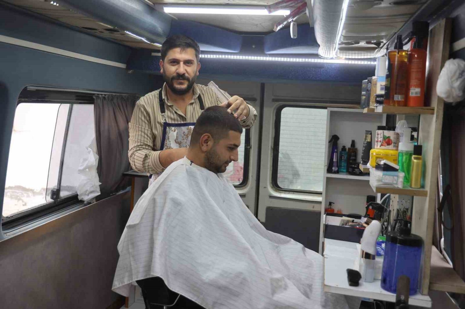 Hatay’ın Defne ilçesinde 15 yıldır berberlik yapan Salih Özçelik, arkadaşı İbrahim Culhacı’yla birlikte minibüsün içerisini düzenleyerek ‘mobil berber aracı’ yaptı. Mobil berber aracıyla ulaşımın zor olduğu yerlere giden iki arkadaş, müşterilerini berber dükkanından farksız mobil berber aracında tıraş ediyorlar.