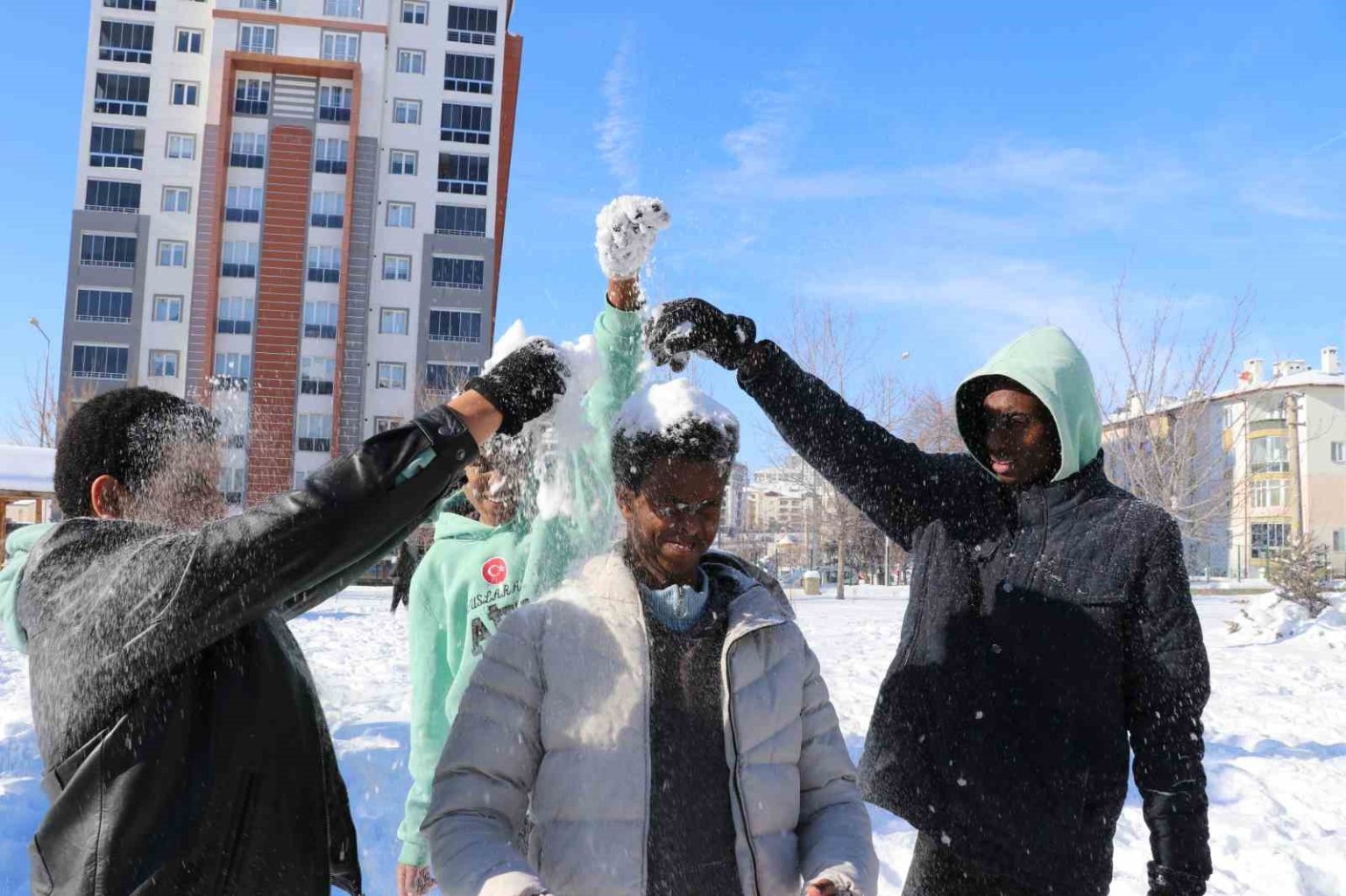 Sivas’ta eğitim gören birçok Afrikalı öğrenci, hayatlarında ilk kez karla tanıştı. Kardan adam yaparak kartopu oynayan öğrenciler doyasıya eğlendi.
