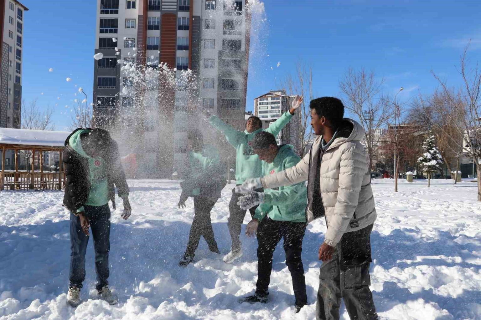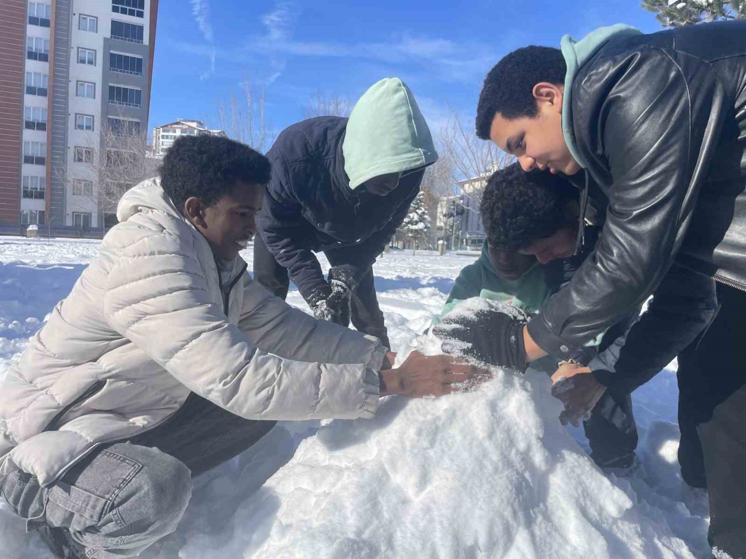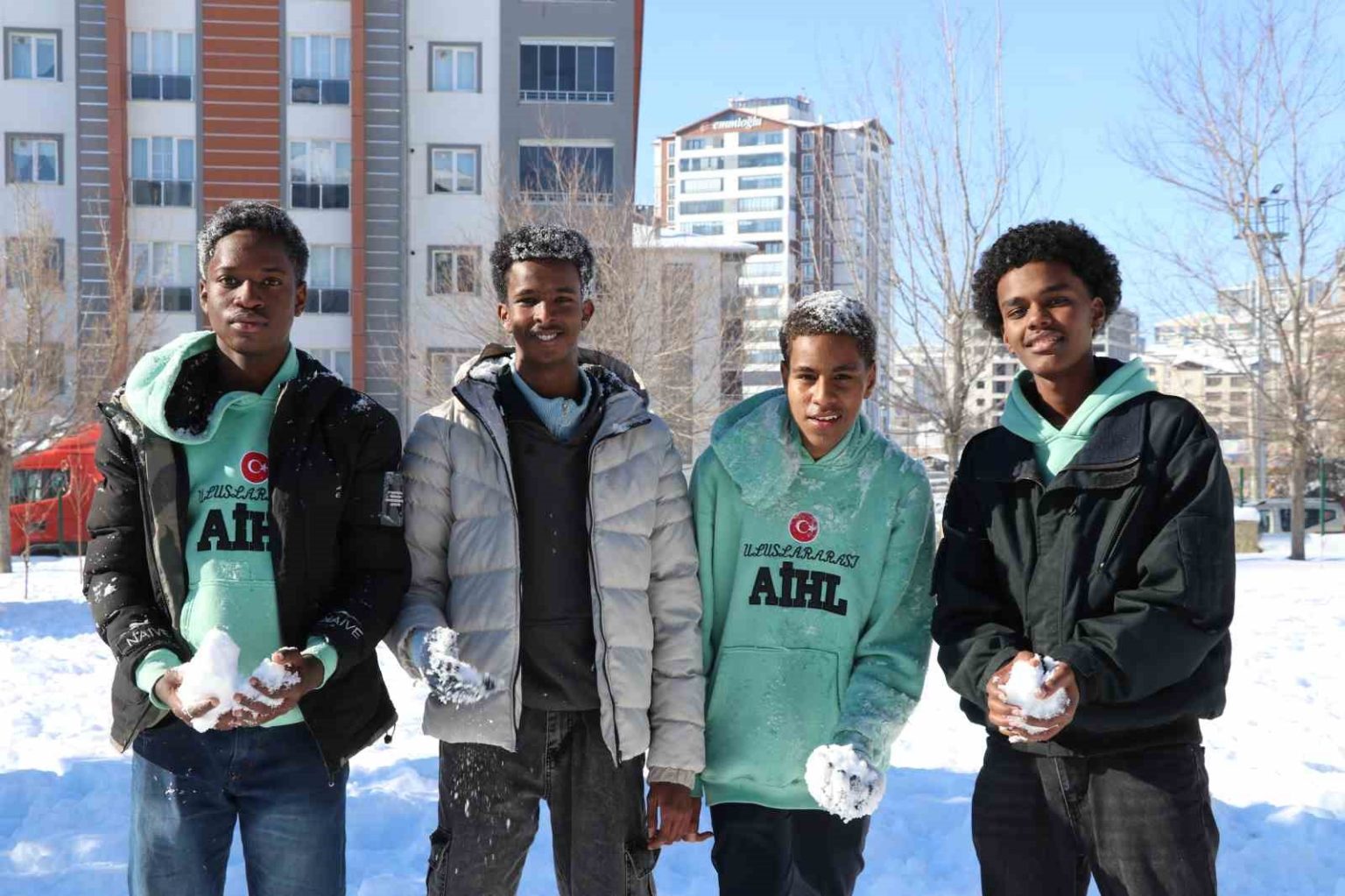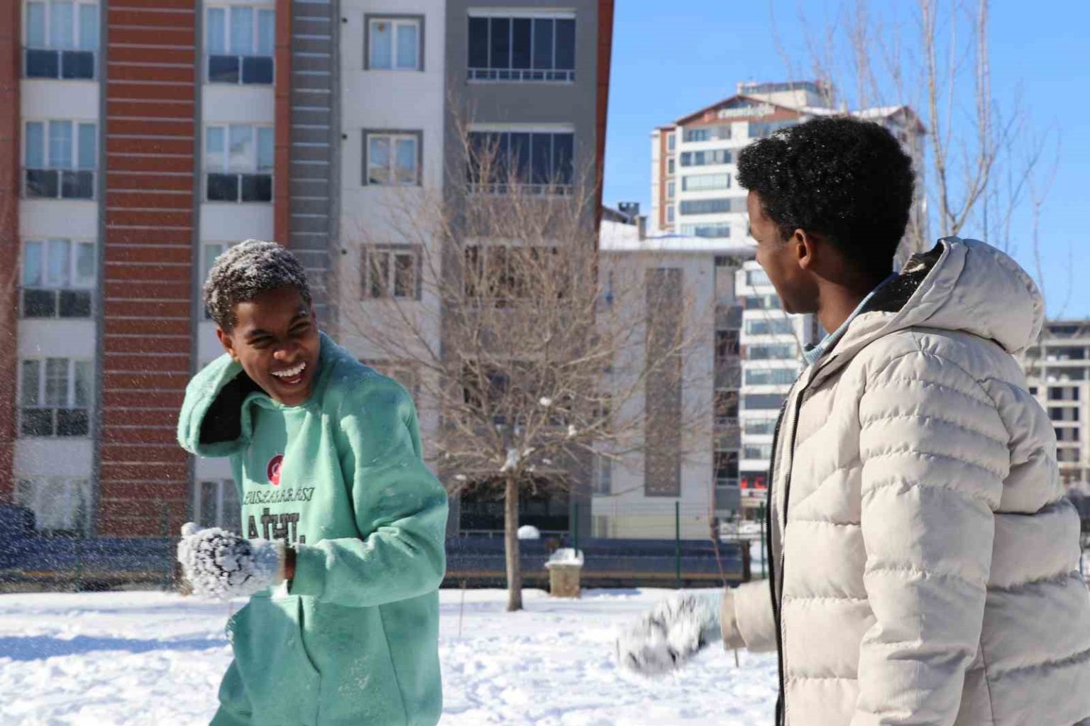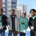 Kenyalı Shueb Ahmed Abdikadir, ilk kez kar gördüğünü belirterek, “Bu sene karı ilk defa görmenin heyecanını yaşadım. Arkadaşlarımla kartopu savaşı yapıp, kardan adam yaptık. Kar yağışının oluşturduğu olumsuz hava şartlarından dolayı okullar tatil edilmişti. Bu duruma da çok sevindik. Karda oynamak çok heyecanlıydı gerçekten” dedi.