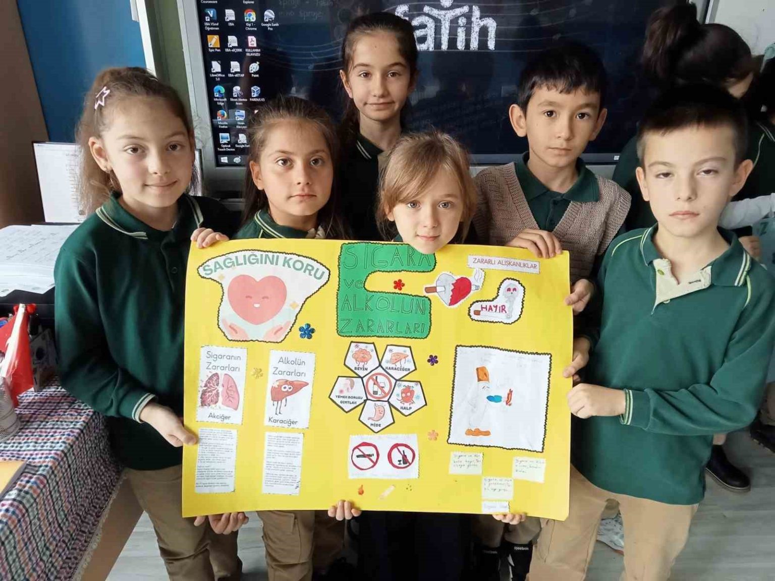 Karaçalı Süperlit İlkokulu 4/B sınıfı öğrencileri, sağlıklı yaşam bilincini geliştirmek ve zararlı alışkanlıklara dikkat çekmek amacıyla “Sigara ve Alkolün Zararları” konulu slogan ve afiş tasarımı etkinliği gerçekleştirdi. Öğretmenleri rehberliğinde düzenlenen grup çalışmasında öğrenciler, sigara ve alkolün hem bireysel hem de toplumsal etkilerini araştırarak kendi fikirlerini afişe yansıttı.