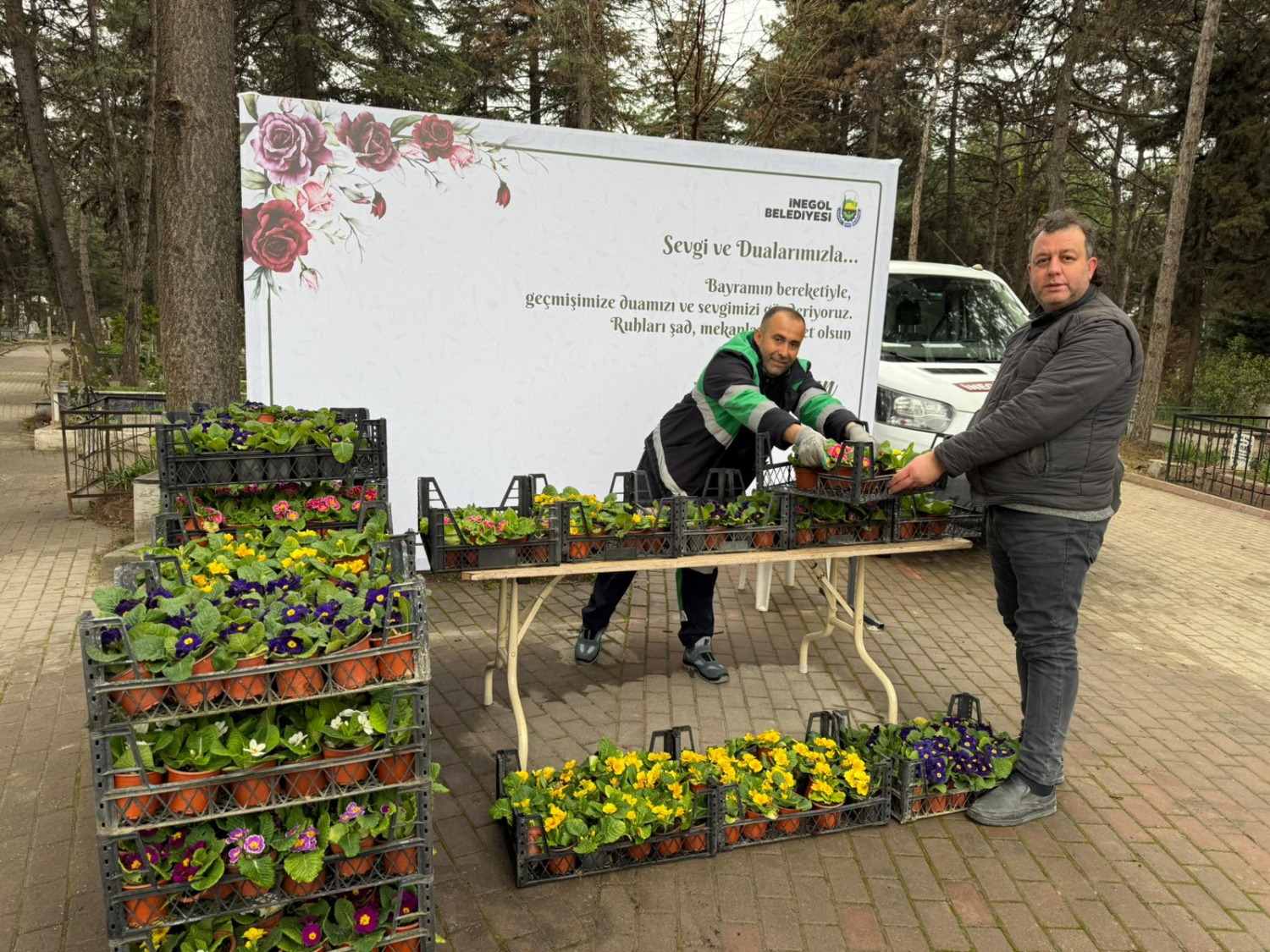 İnegöl Belediyesi, Ramazan Bayramı arifesinde mezarlık ziyaretine gelen vatandaşlara ücretsiz 9 bin adet çiçek dağıtarak anlamlı bir uygulamayı bu yıl da sürdürdü.