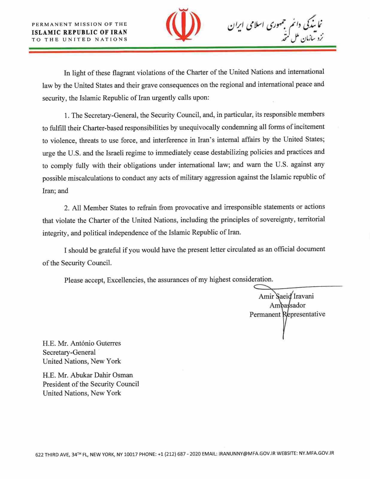 BM Genel Sekreteri Antonio Guterres, BM Güvenlik Konseyi ve konsey üyesi ülkelere ABD’nin İran’ın iç işlerine müdahalesine ve güç kullanma tehditlerine karşı çıkma çağrısı yapan İravani, “Tüm üye devletler, İran İslam Cumhuriyeti’nin egemenliği, toprak bütünlüğü ve siyasi bağımsızlığı ilkeleri dahil BM Şartı’nı ihlal eden kışkırtıcı ve sorumsuz açıklamalardan veya eylemlerden kaçınmalıdır” ifadelerine yer verdi. İravani, gönderdiği mektubun resmi bir belge olarak BM Güvenlik Konseyi üyesi ülkelere dağıtılmasını talep etti.