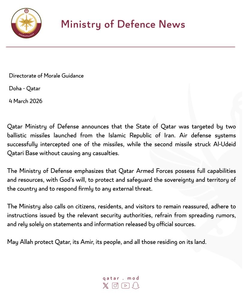 Katar Savunma Bakanlığı’ndan yapılan açıklamada, İran’dan fırlatılan 2 balistik füzeden birinin ABD tarafından kullanılan El-Udeid Hava Üssü’ne isabet ettiği, ancak saldırıda herhangi bir can kaybı yaşanmadığı bildirildi. El-Udeid Hava Üssü, ABD’nin Orta Doğu bölgesindeki en büyük askeri üssü olarak biliniyor.