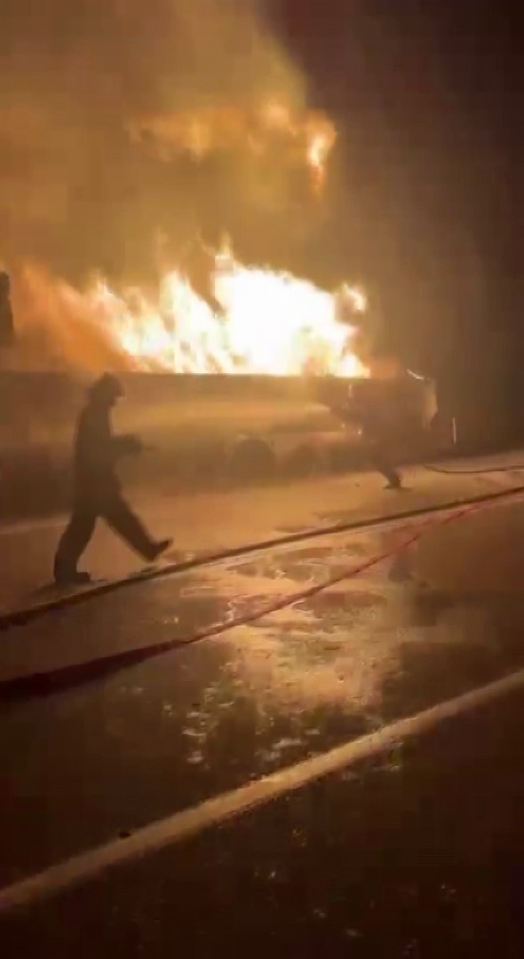 Isınan tekerlek balatalarından çıkan alevler sunta yüklü tırı yaktı