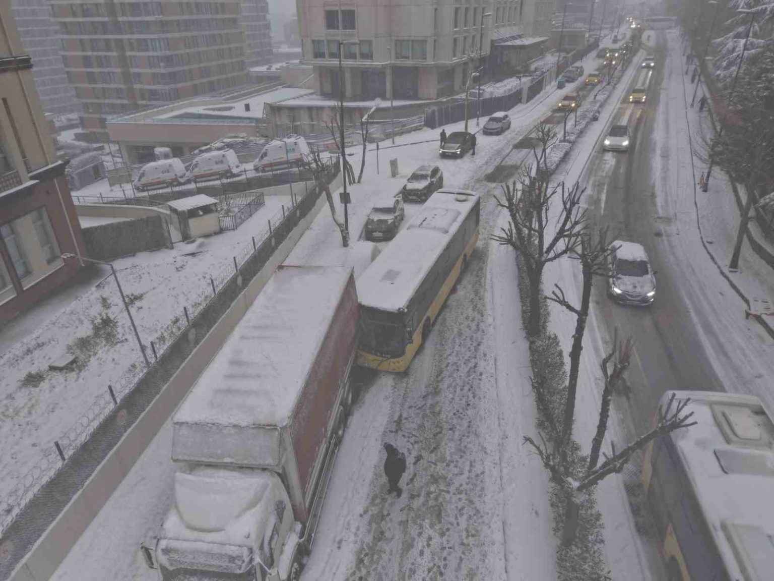 İstanbul’da etkili olan kar yağışı bazı bölgelerde kazaları da beraberinde getirdi. Bahçelievler 29 Ekim Caddesi’nde seyir halindeki bir İETT otobüsü karla kaplı yolda kayarak park halindeki kamyona çarptı. Otobüsün boş olduğu öğrenilirken, kaza nedeniyle trafikte aksamalar yaşandı. Otobüs yol kenarına çekildi. İETT otobüsünde hasar oluşurken, kaza yapan araç havadan görüntülendi.