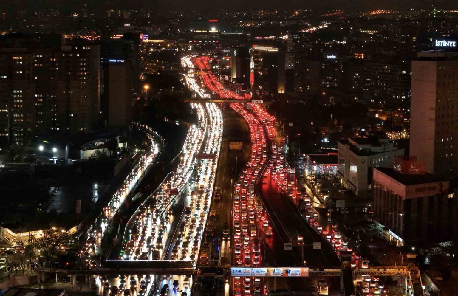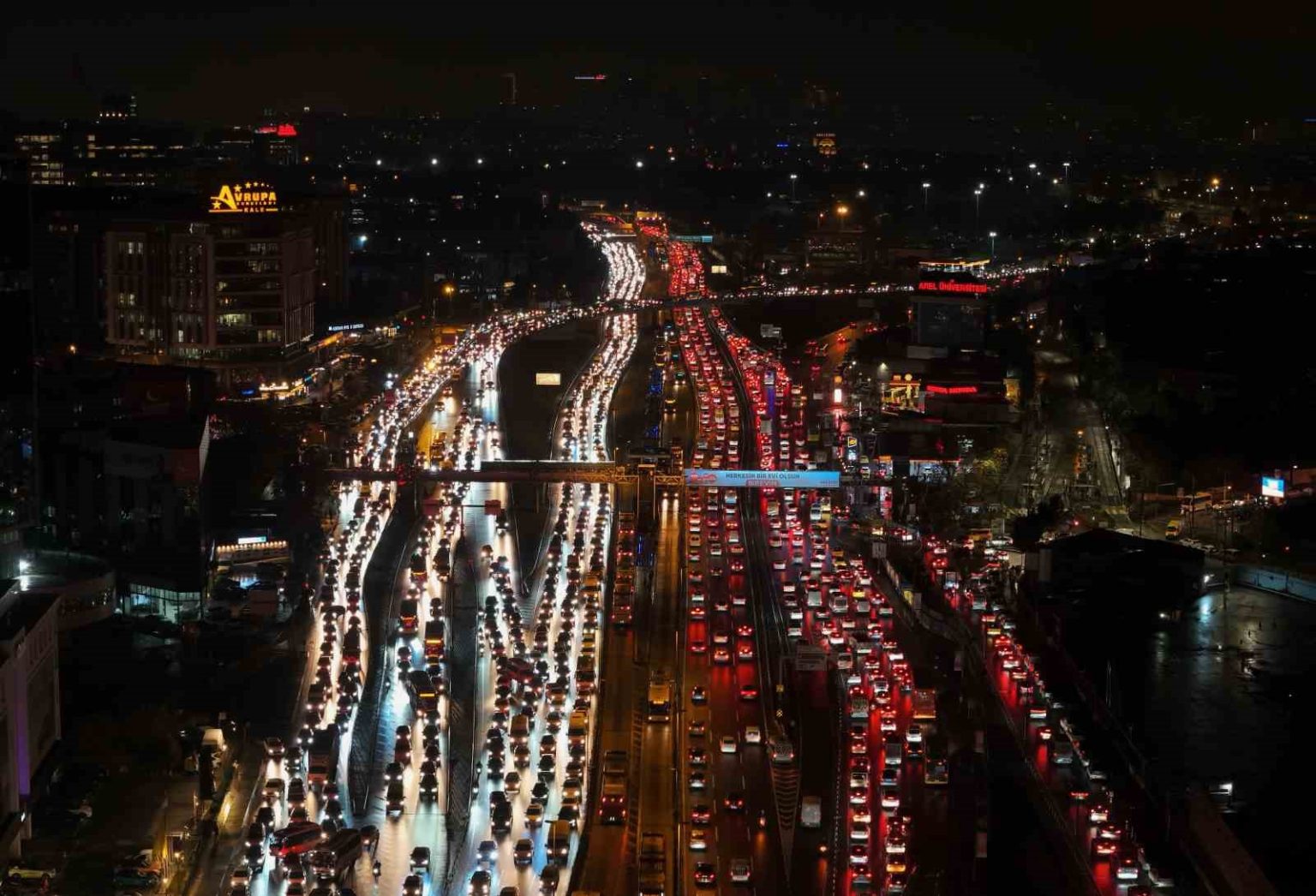 İstanbul genelinde trafik yoğunluğu yüzde 90 seviyelerine ulaştı. Özellikle ana arterler, çevre yolları ve bağlantı noktalarında araçlar zaman zaman ilerlemekte güçlük çekti. Birçok noktada trafik neredeyse durma noktasına gelirken, sürücüler uzun süre direksiyon başında beklemek zorunda kaldı. Havadan çekilen görüntüler, trafiğin boyutunu gözler önüne serdi. Cevizlibağ E-5 üzerinde araçların kilometrelerce uzayan kuyruklar oluşturduğu, trafiğin ağır ağır ilerlediği görüldü. Bazı sürücüler alternatif güzergahlara yönelirken, bu durum ara sokaklarda da yoğunluğun artmasına neden oldu. Havadan çekilen görüntülerde İstanbul trafiğinde oluşan kilometrelerce araç kuyruğu net bir şekilde gözler önüne serildi.