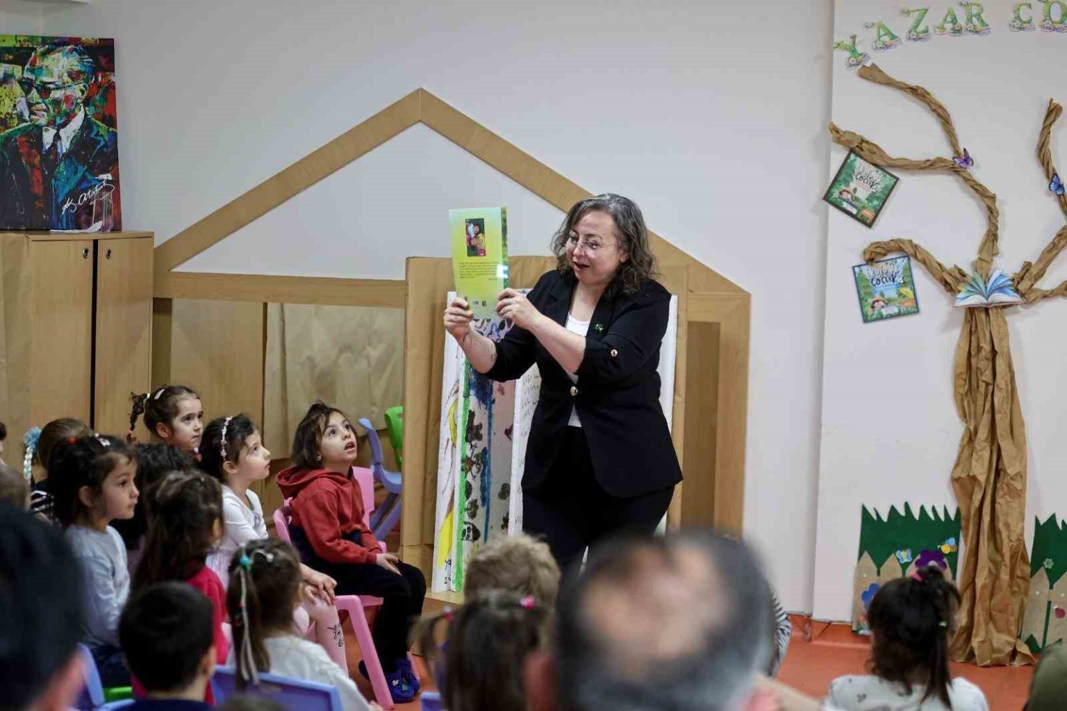 Okul öncesi öğretmeni Nilay Yücel, depremde kaybettiği kızlarının anısını yaşatmak amacıyla kaleme aldığı “Vera & Lena Doğada Neler Oluyor?” adlı kitabı çocuklara okudu. Aynı zamanda 22 öğrencisi bulunan bir okul öncesi öğretmeni olduğunu belirten Yücel, çocuklara depremi ve doğa olaylarını onların anlayabileceği bir dille anlattı. Etkinlikte ayrıca, Yücel’in kızları Vera ve Lena’nın fotoğraflarından yapay zekâ yardımıyla hazırlanan kısa bir video da çocuklara izletildi. Minik öğrencilerin dikkatle takip ettiği video, etkinliğe katılanlara duygu dolu anlar yaşattı.
