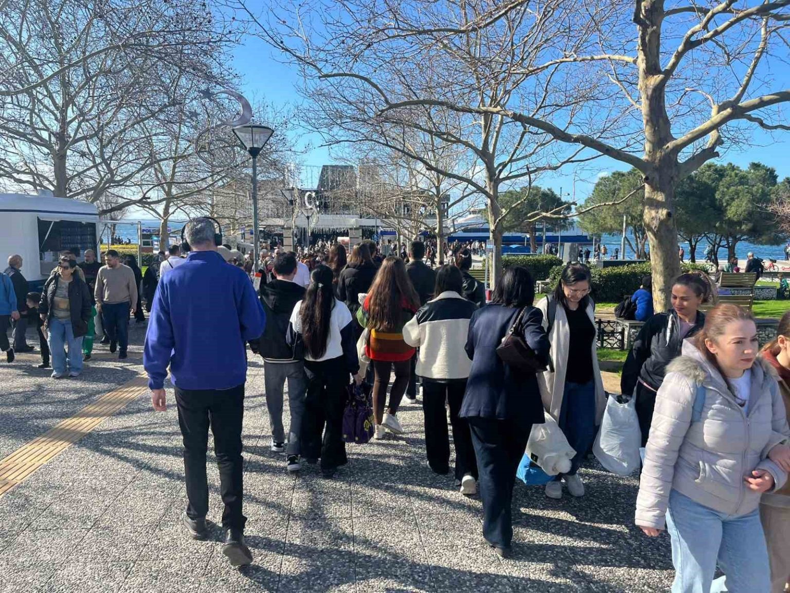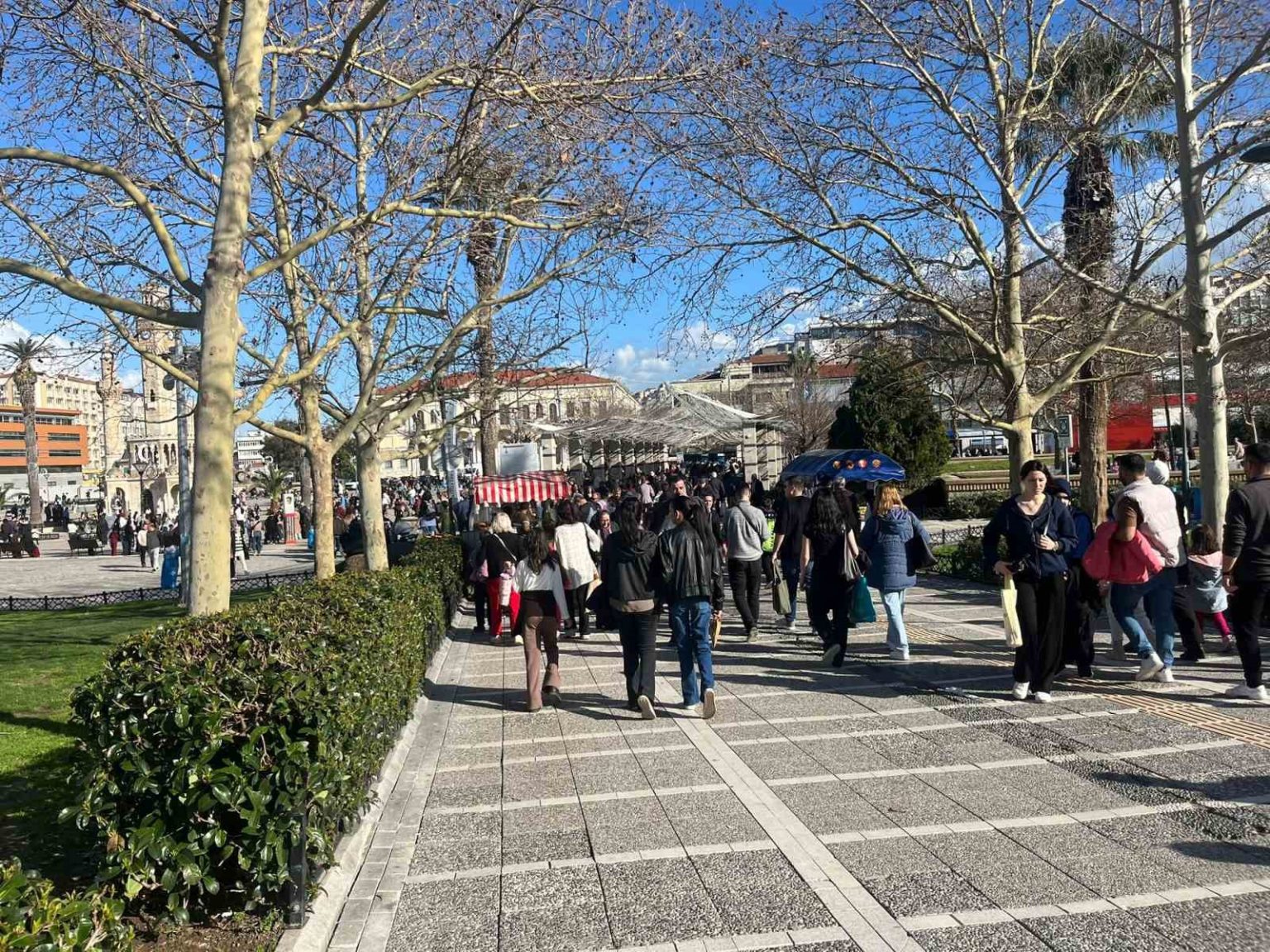 Kentte bir süredir devam eden yağışlı havanın yerini güneşe bırakmasıyla birlikte vatandaşlar kendilerini dışarı attı. Özellikle Konak Atatürk Meydanı ve sahil bandında insan yoğunluğu yaşandı. Hafta sonu tatilini ve güzel havayı değerlendirmek isteyenlerin oluşturduğu kalabalık, ana caddelere de yansıdı. Vatandaşların sokağa çıkmasıyla birlikte toplu taşıma araçlarında da hareketlilik gözlendi. Vapur seferlerinde doluluk oranları artarken, tramvay ve metro istasyonlarında yoğunluk oluştu. Güneşli havanın tadını çıkarmak isteyen vatandaşlar, sahil kenarlarında yürüyüş yaparak ve deniz havası alarak vakit geçirdi.