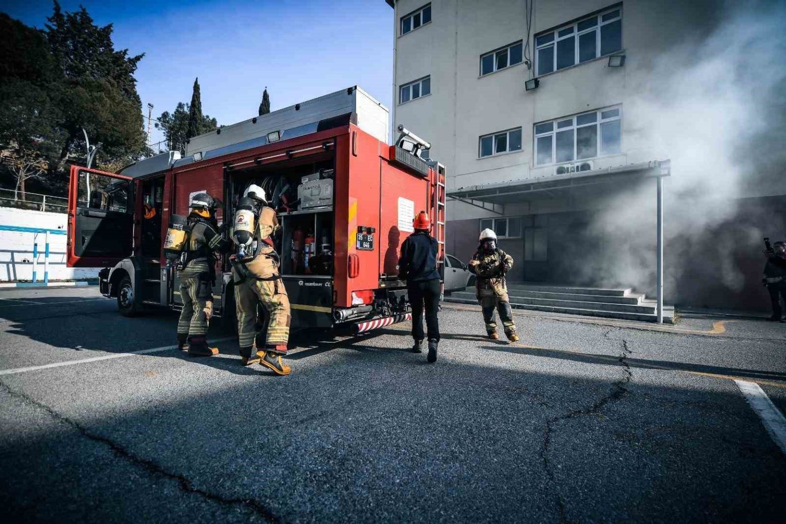 İtfaiye Dairesi Başkanlığı ekipleri tarafından Buca’da bulunan Rüştü Ünsal Polis Meslek Yüksekokulu’nda yangın tatbikatı gerçekleştirildi. Tatbikat senaryosuna göre, 4 katlı binanın zemin katında yer alan bir derslikte elektrik hatlarından kaynaklanan bir yangın çıktı. Dumanların hızla binayı sarması üzerine vakit kaybetmeden 112 Acil Çağrı Merkezi’ne haber verildi. İhbar üzerine kısa sürede olay yerine ulaşan itfaiye ekipleri, yangına hızla müdahale ederek alevleri kontrol altına almayı başardı.