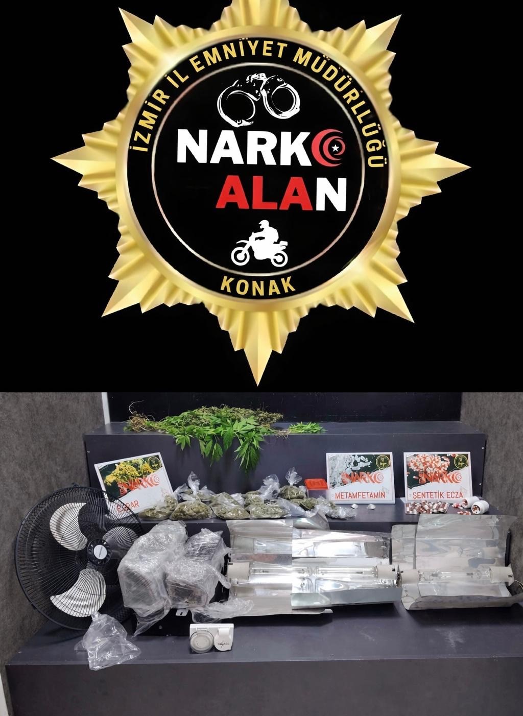 Konak İlçe Emniyet Müdürlüğü ve Narkotik Suçlarla Mücadele Şube Müdürlüğü personelinden oluşan Narko Alan ekipleri, uyuşturucu madde ticareti ve imalatını önlemeye yönelik çalışmalarını sürdürüyor. Bu kapsamda ekipler, ilçede bulunan bir adreste uyuşturucu madde yapımında kullanılan bitkiler yetiştirildiğini tespit etti. Polis ekiplerince sera sisteminin kurulduğu evde yapılan aramada 416,06 gram esrar, 40 kök Hint keneviri, 7 gram kenevir tohumu, 5,54 gram metamfetamin, 54,56 gram kokain ile 105 adet sentetik ecza ele geçirildi. Ayrıca kenevir yetiştirmekte kullanılan çeşitli aletlere de el konuldu. Operasyonda evde bulunan 1 şüpheli polis ekiplerince gözaltına alındı. Emniyetteki işlemlerinin ardından adliyeye sevk edilen şüpheli, çıkarıldığı mahkemece tutuklanarak cezaevine gönderildi.