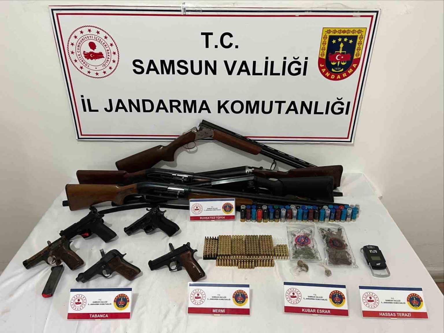 Samsun İl Jandarma Komutanlığı ekipleri, kaçakçılık olayları ile uyuşturucu ve uyarıcı madde ticaretinin önlenmesine yönelik yürütülen çalışmalar kapsamında 3 şahsın ruhsatsız silah ve uyuşturucu madde bulundurduğu bilgisine ulaştı. Jandarma ekipleri şüphelilerin ikametlerinde arama yaptı. Yapılan aramalarda 5 adet ruhsatsız tabanca, 5 adet ruhsatsız av tüfeği, 1 adet hassas terazi ile bir kubar esrar maddesi ele geçirildi. Olayla ilgili adli işlem başlatıldı.