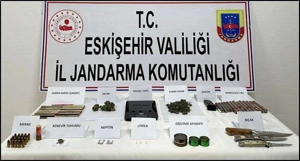 Eskişehir İl Jandarma Komutanlığı ekiplerince uyuşturucu suçları ile mücadeleye yönelik yürütülen istihbarı çalışmaları neticesinde Çifteler ilçesinde 2 şahsın araç içerisinde uyuşturucu kullandığı bilgisi alındı. Tespit edilen araçta, 2 şahsın üzerinde ve ikametlerinde yapılan aramada, 17 gram kubar esrar, 13 gram skunk, 6 gram kenevir tohumu, 1 adet hassas terazi, 5 adet sentetik ecza hap, 14 adet bandrolsüz puro, 11 adet sigara sarma kağıdı, 2 adet öğütücü aparat, 1 adet tabanca şarjörü, 20 adet tabanca fişeği, 1 adet av tüfeği fişeği ve 3 adet bıçak ele geçirildi. Olayla ilgili yakalanan 2 şüpheli şahıs hakkında, soruşturma başlatıldı.
