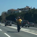 Kadıköy D-100 Karayolu’nda plakasız bir motosikletlinin tek teker üzerinde uzun süre yaptığı tehlikeli yolculuk cep telefonu kamerasınca kaydedildi.