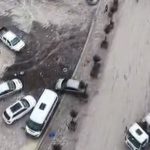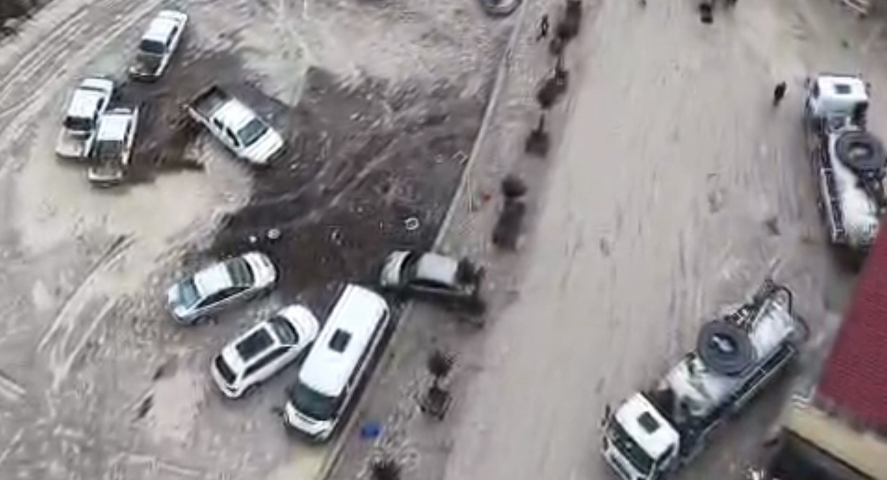 Dron ile havadan kaydedilen görüntülerde, dere yatağının taştığı ve yolların su altında kaldığı, birçok noktada çamur ve balçık birikintilerinin oluştuğu görüldü.