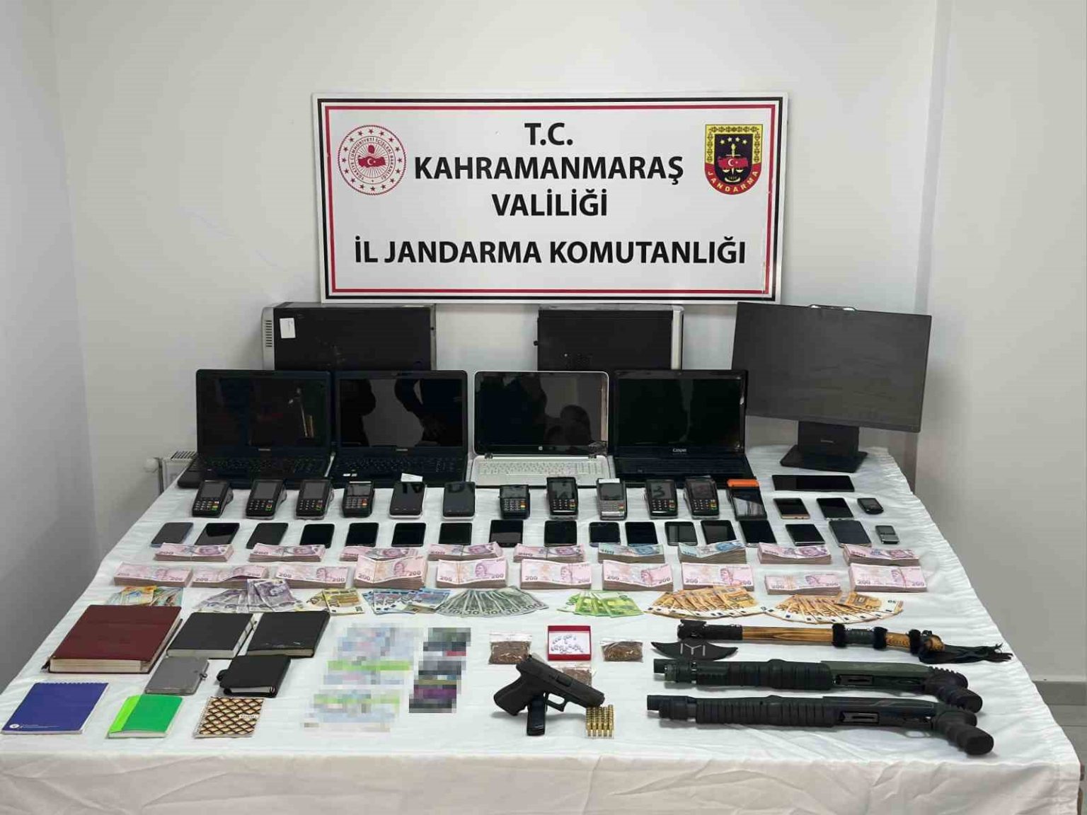 Şüphelilerin ev ve araçlarında yapılan aramalarda; 21 cep telefonu, 12 pos cihazı, 29 kredi kartı, 13 senet, 18 çek, 9 alacak-verecek defteri, 750 bin TL, 600 dolar, 900 euro, 160 İsviçre frangı, 4 dizüstü bilgisayar, 2 bilgisayar kasası, 12 flaş bellek, 1 tablet, 1 ruhsatsız tabanca, 2 pompalı tüfek, 46 pompalı tüfek fişeği, 44 tabanca fişeği, 52 bonzai ve 26 sentetik ecza hapı ele geçirildi. Operasyon kapsamında gözaltına alınan 17 şahıs, jandarmadaki işlemlerinin ardından sevk edildikleri adli makamlarca tutuklandı.