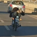 Görüntülerde, motosiklet sürücüsünün uzun süre bu şekilde yoluna devam ettiği, sonra gözden kaybolduğu görüldü.