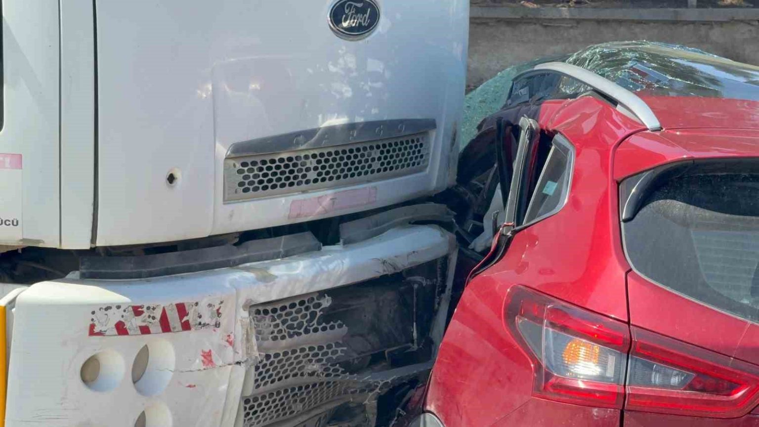 Kamyonun sürüklediği otomobilden burunları bile kanamadan çıktılar