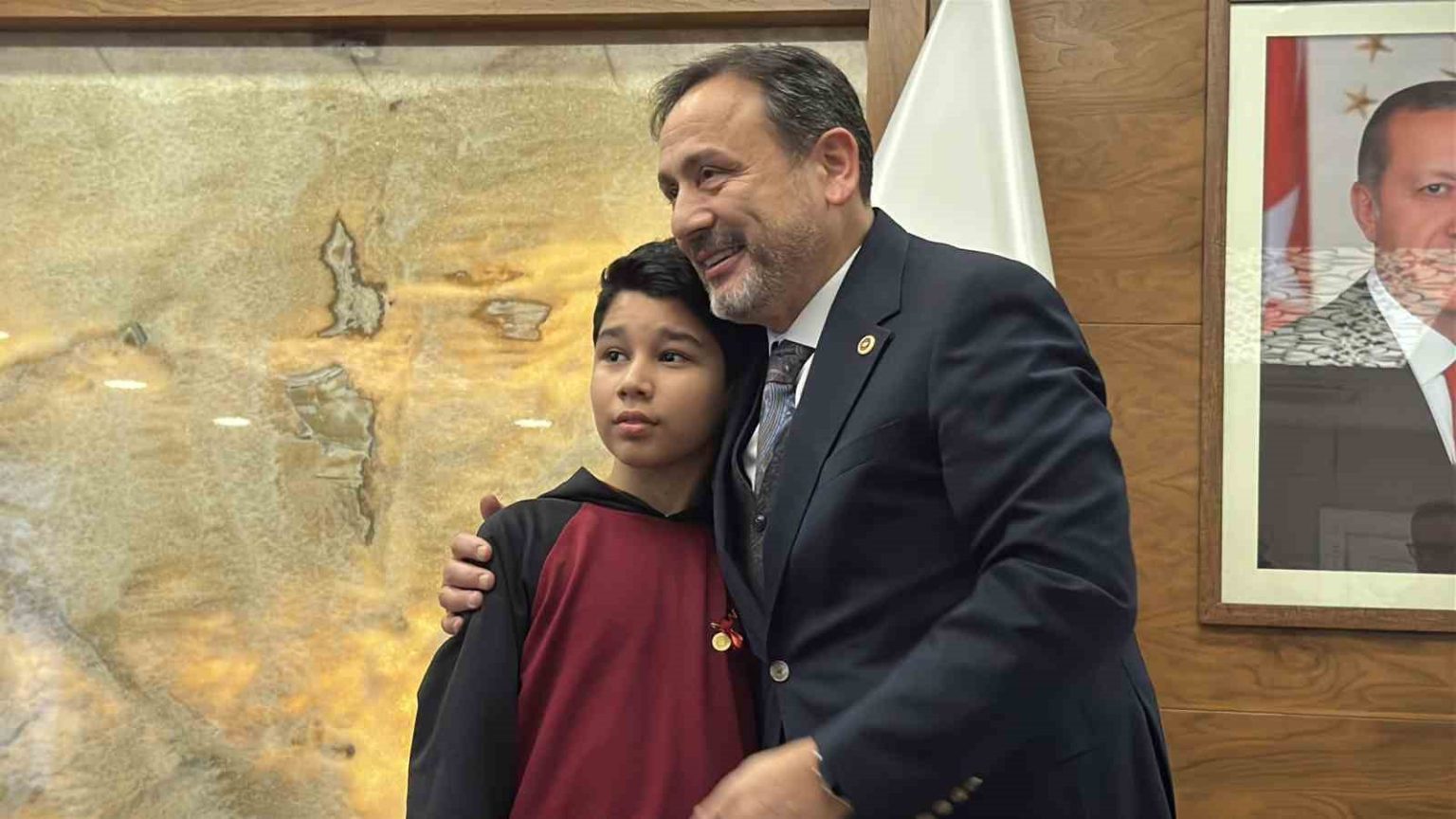 Çetinkaya, davranışından dolayı öğrenciyi tebrik edip bir süre sohbet ederek işlemeli Türk Bayrağı ile çeşitli hediyeler takdim etti.