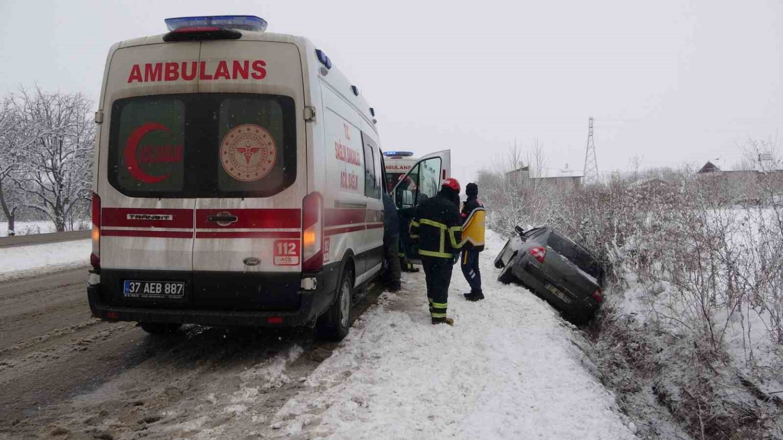 Kastamonu’da kar yağışı sebebiyle kayganlaşan yolda kontrolden çıkarak yan yatan otomobildeki 4 kişi yaralandı.