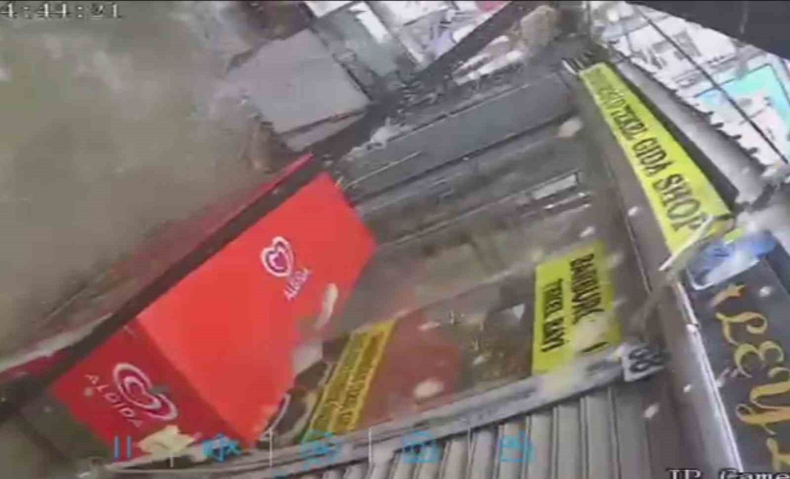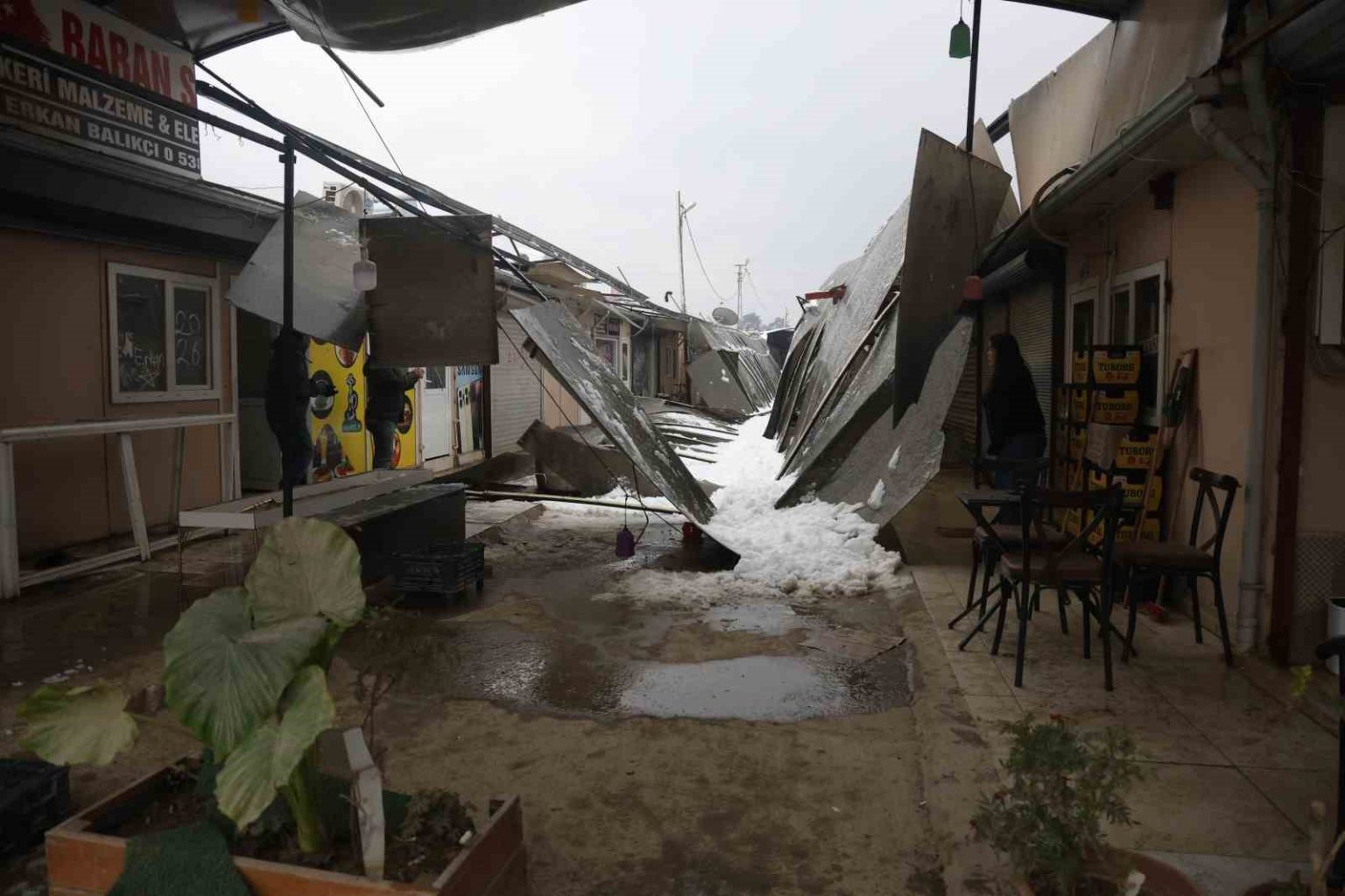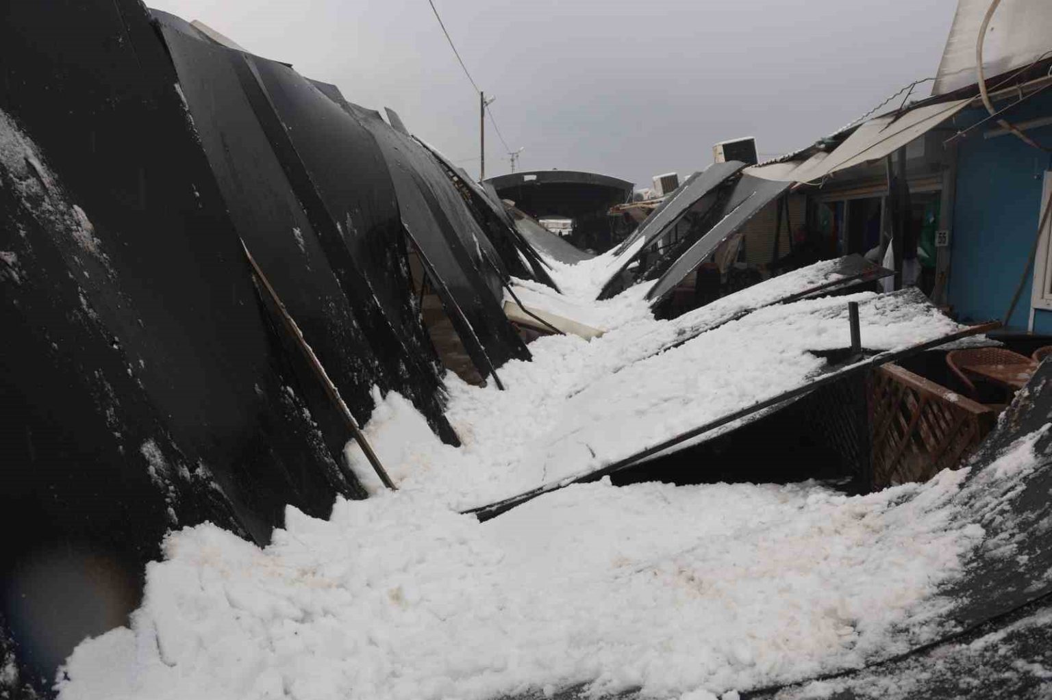 Hatay’da etkili olan şiddetli yağışla birlikte biriken kar kütlesini taşıyamayan prefabrik çarşısının plastik çatısı yıkıldı. Çatının yerle bir olduğu anlar kameraya yansırken olayda yaralanan olmadı.