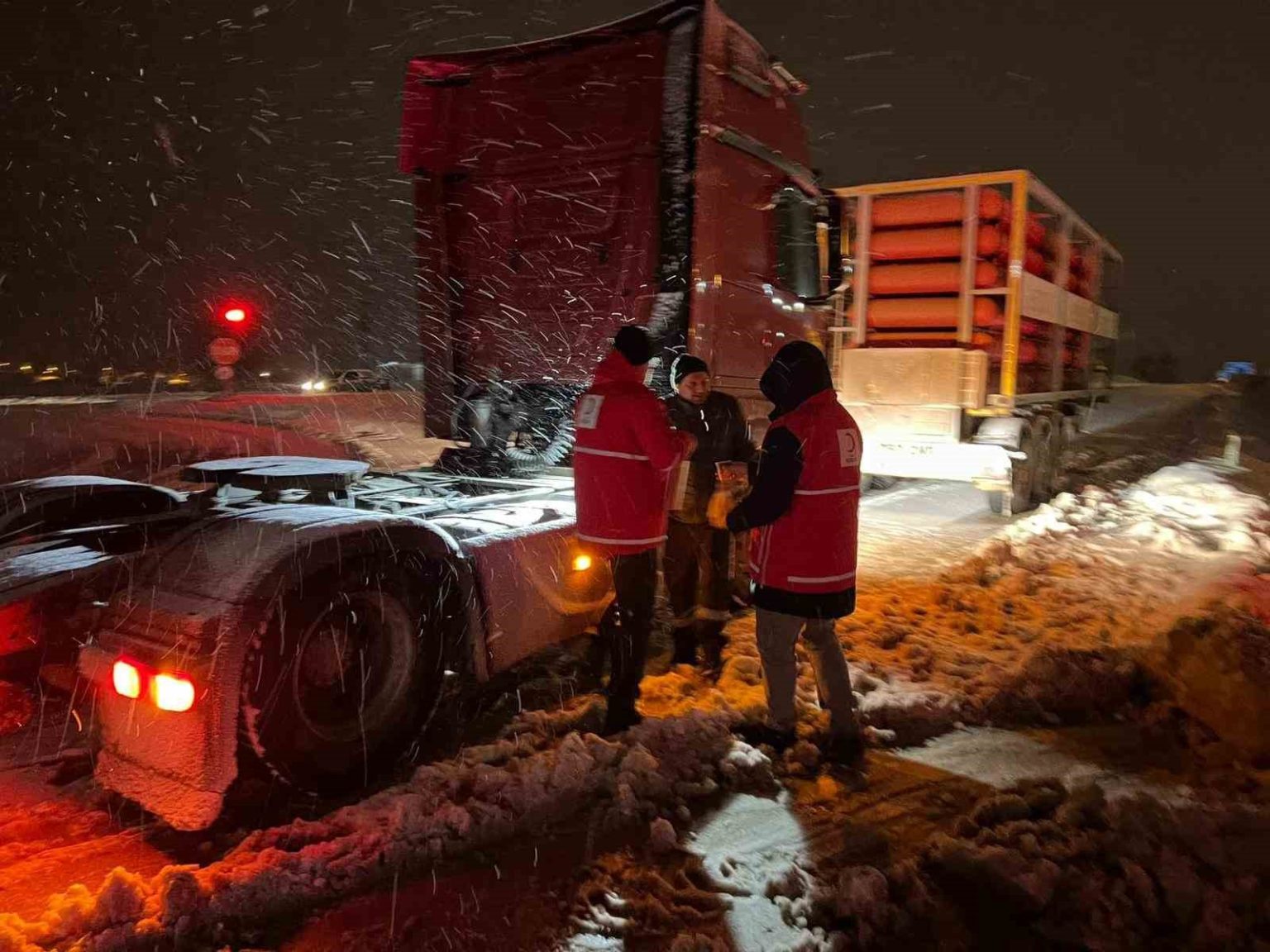Kar sebebiyle kapanan yolda ekiplerden vatandaşlara sıcak içecek ikramı