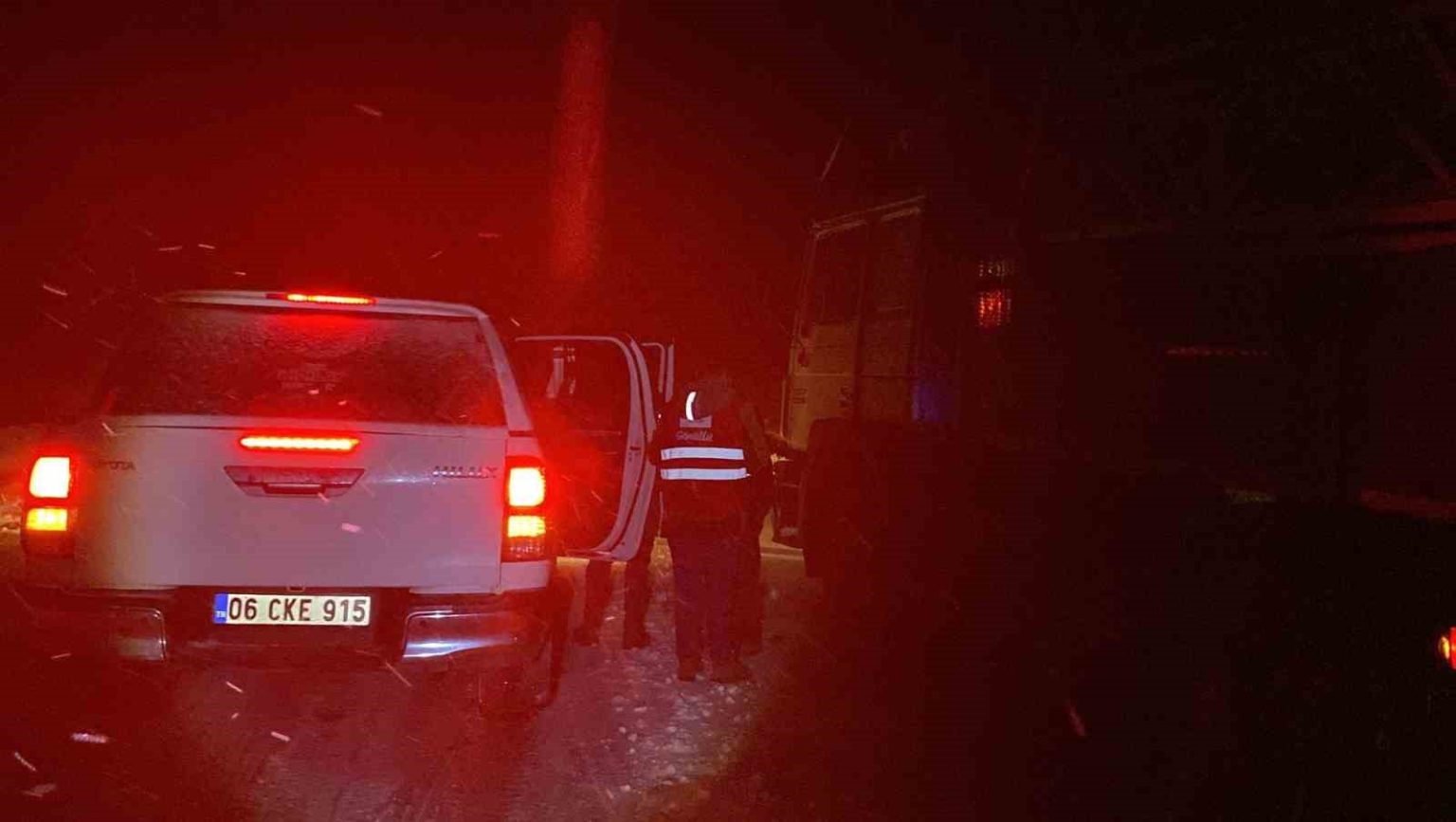 Jandarma ekipleri bölgede çalışmalarını sürdürürken, karla mücadele ekipleri de yolu yeniden ulaşıma açmak için yoğun mesai harcıyor.