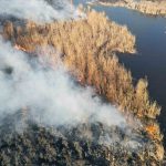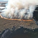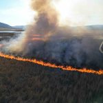 Yanan sazlıklardan yükselen alevler dron ile havadan görüntülenirken, çıkan alev ve dumanlar ise kilometrelerce uzaktan görüntü. Göldeki yangının devam ettiği belirtildi.