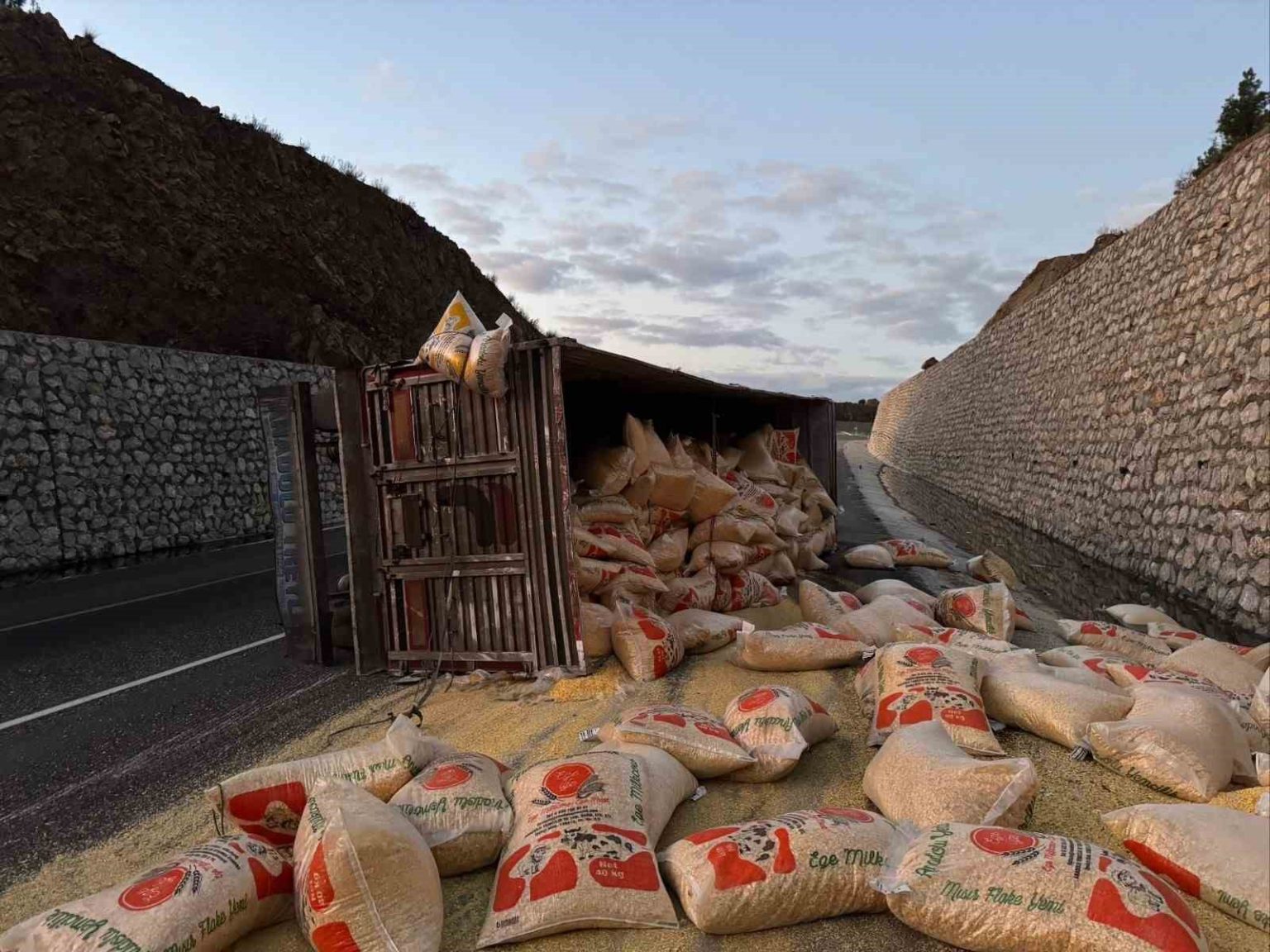Karayolunda yem yüklü tır devrildi: 2 yaralı