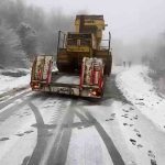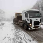 Zonguldak’tan Bartın’daki Çöp Depolama ve Geri Dönüşüm Tesisi’ne iş makinesi taşıyan bir tır, yoğun kar yağışı ve buzlanma nedeniyle kayarak yolu ulaşıma kapattı. Bartın -Amasra eski kara yolu Kazpınarı köyü mevkisinde meydana gelen olayın ardından bölgeye jandarma ve karla mücadele ekipleri yönlendirildi. Yaklaşık 2.5 saat trafiğe kapatılan yoldaki tırı kurtarmak için iş makineleri ile yoğun bir çalışma başlatıldı. Jandarma ekipleri tarafından ise alınan güvenlik tedbirleri ile trafik tünel yoluna yönlendirildi. Kar küreme ve tuzlama çalışmalarının tamamlanmasının ardından üstünde iş makinesi bulunan tır, tesise ulaştırıldı.