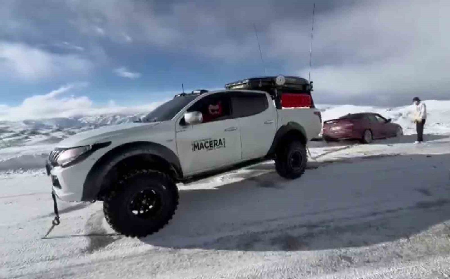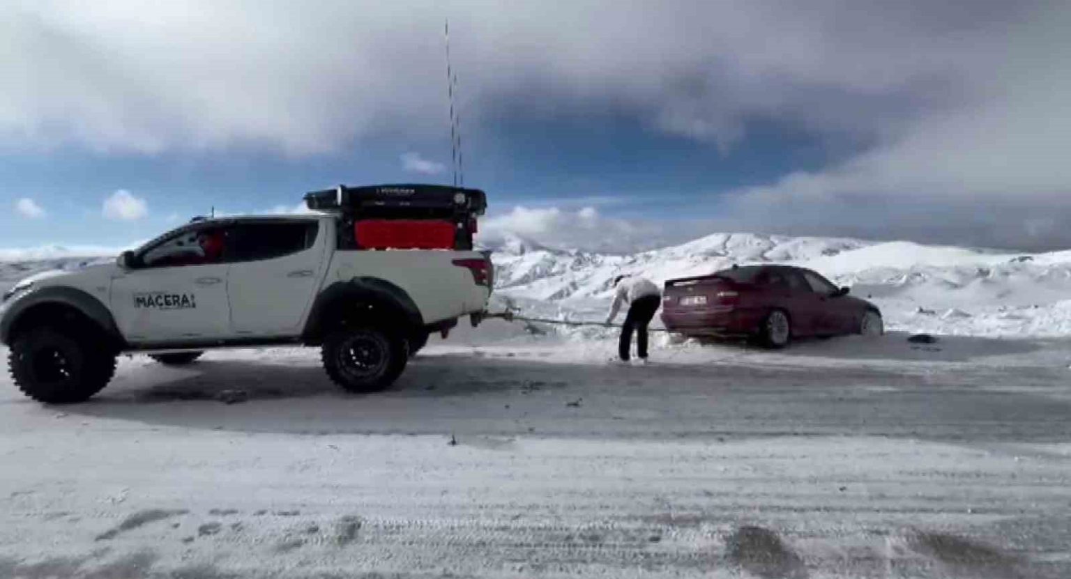 Erzurum’un Tekman ilçesine yönüne giden bir araç, kaygan yol sebebiyle kara saplandı. Karda mahsur kalan sürücü, Erzurum Macera Off-road Arama Kurtarma Ve Doğa Sporları Kulübü üyesi Recep Tepe’ye ulaşarak yardım istedi. Yardım talebini geri çevirmeyen Tepe, zorlu çalışma sonrası aracı mahsur kaldığı yerden çıkardı.