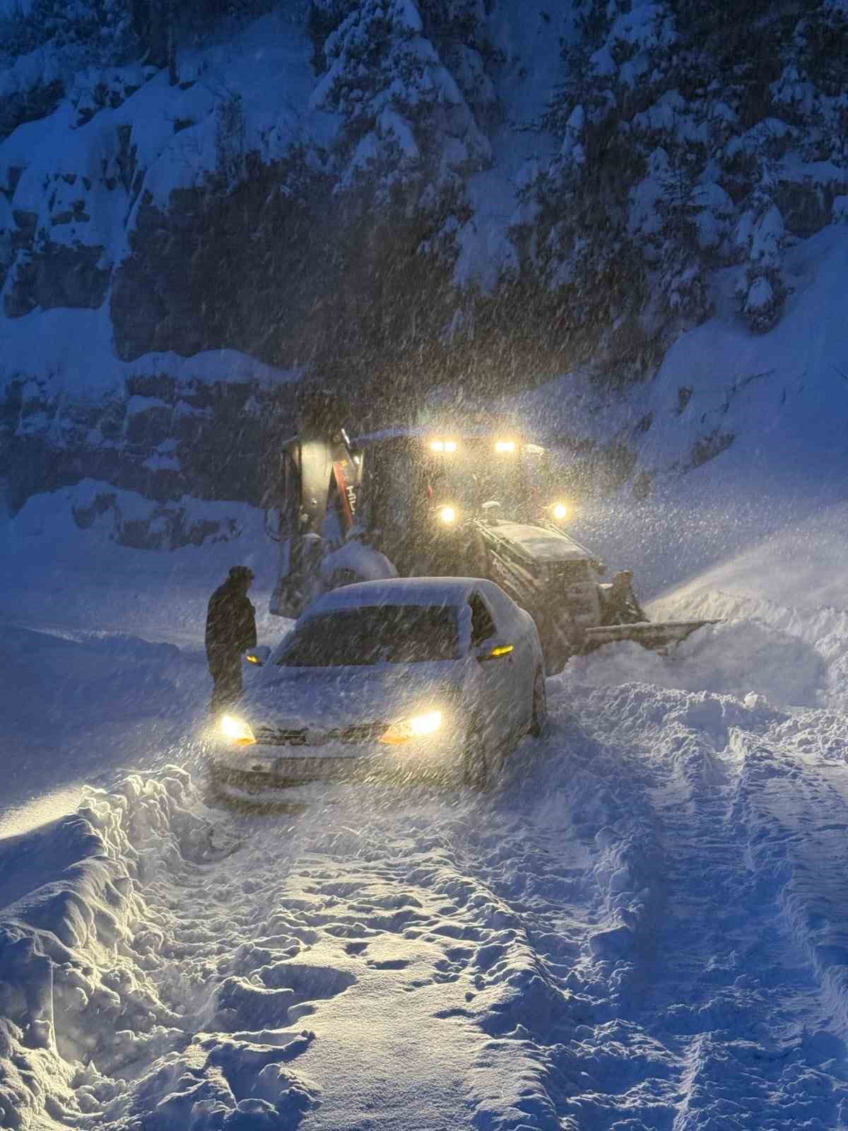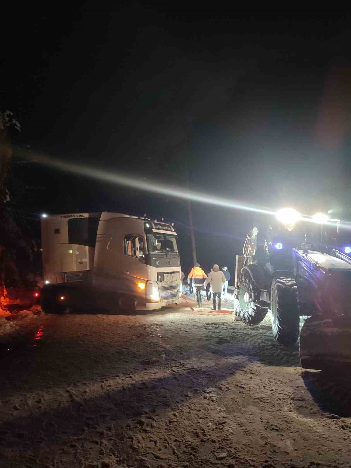 Bu kapsamda, dün gece saatlerinde yoğun kar yağışı nedeniyle yolda ilerlemekte güçlük çeken ve mahsur kalan bir tır sürücüsünün imdadına belediye ekipleri yetişti. Bölgeye sevk edilen iş makineleriyle yapılan çalışmalar sonucu tır güvenli şekilde kurtarılarak yoluna devam etmesi sağlandı.