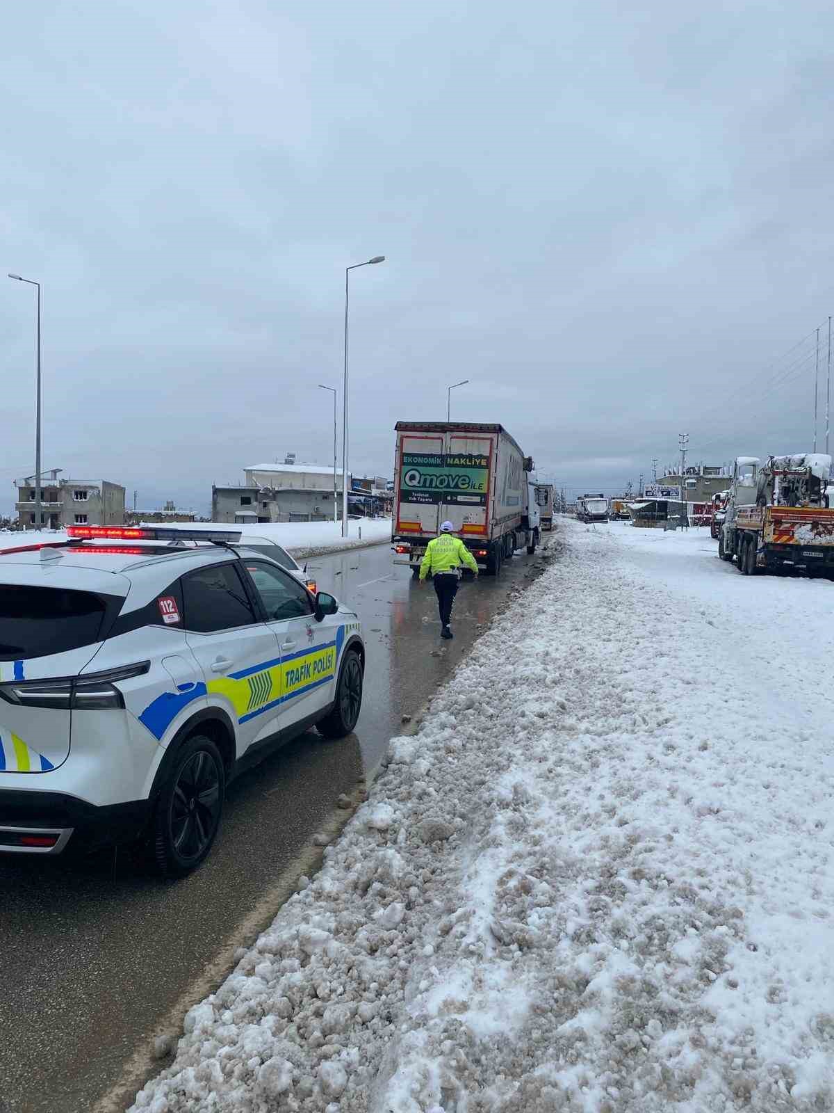 Hatay’da etkili olan kar yağışı sonrası araçlarıyla yollarda mahsur kalan vatandaşlara polis ekipleri yardım etti.