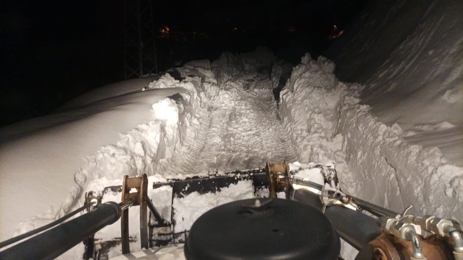 Karla mücadele ekipleri, ambulansın güvenli şekilde dönüş yapabilmesi için gece saatlerinde de yol açma çalışmalarını sürdürerek ambulansa eşlik ediyor.