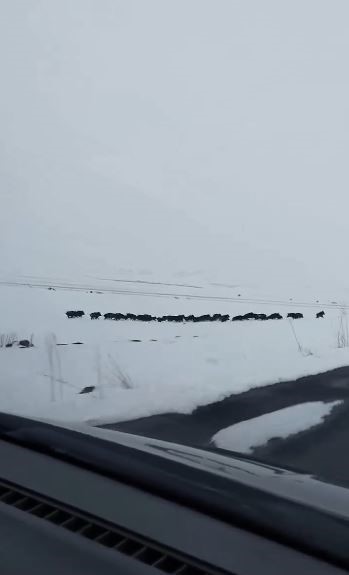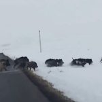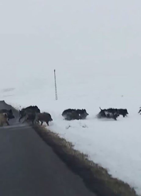 Ardahan’da zaman zaman karayoluna kadar inen yaban domuzları bu kez karla kaplı Ardahan’ın Çıldır ilçesinde karayolundan geçerken sürü halinde görüntülendi. Çıldır ilçesine bağlı Yukarı Cambaz ve Aşağı Cambaz köyleri arasında bulunan karla kaplı arazide ilerleyen domuzlar, yoldan geçen vatandaşlarca cep telefonu kamerasıyla görüntülendi. Araçlarıyla köylerine giden vatandaşlar meradan geçerek ormanlık alana doğru ilerleyen domuzları cep telefonlarıyla kaydetti.