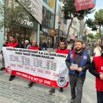 Karşıyaka Belediyesi bünyesinde çalışan işçiler, 7 aydır süregelen maaş krizi nedeniyle Karşıyaka Çarşısı’nda yürüyüş düzenledi. Hazırladıkları bildirileri halka ve esnafa dağıtan belediye emekçileri, biriken alacaklarının tek seferde ödenmesini talep ederek seslerini duyurmaya çalıştı. Belediye işçilerinin ekonomik durumlarını bildikleri için artık ev sahiplerinin ev bile kiraya vermediğine değinen DİSK/Genel-İş İzmir 10 No’lu Şube Başkanı Ferit Akdoğan, sorunun acil olarak çözülmesi gerektiğine vurgu yaptı.