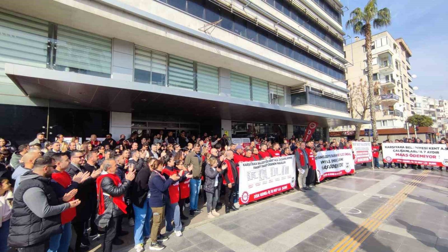 Karşıyaka Belediyesi iştiraki Kent A.Ş.’de çalışan 540 işçi, 7 aydır biriken maaş alacaklarının ödenmemesi ve randevu iptaline tepki göstererek belediye binası önünde eylem gerçekleştirdi.