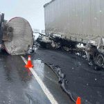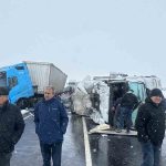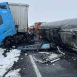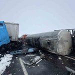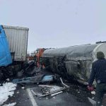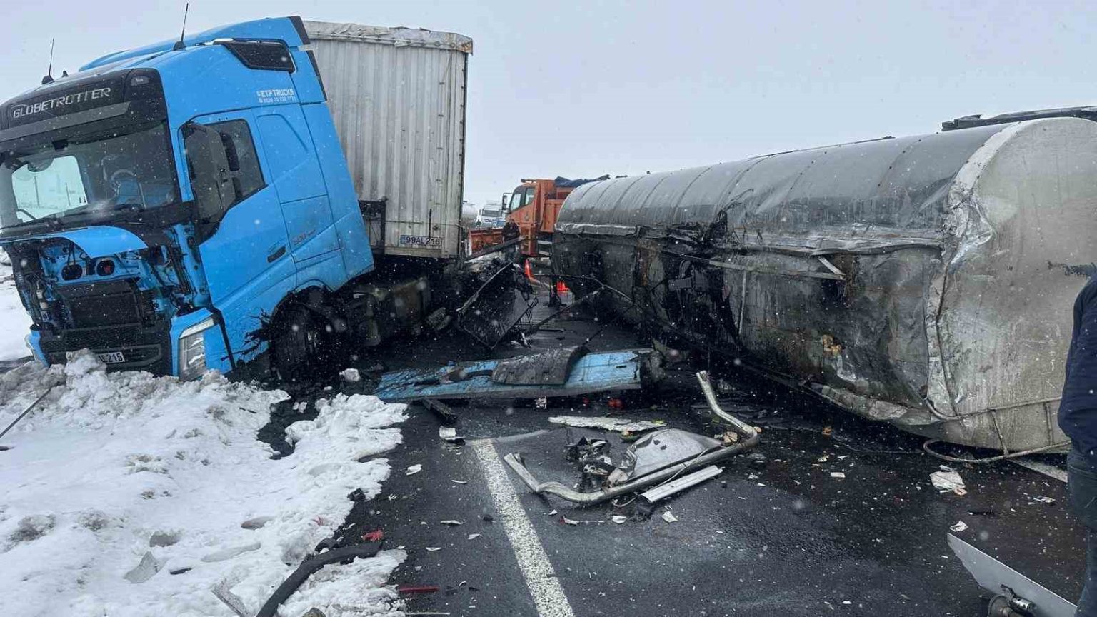 Kaza, Kars – Çıldır kara yolunda meydana geldi. Kars’tan Çıldır istikametine seyir halindeki zift yüklü tanker havanın kar yağışlı ve sisli olmasından dolayı yoldan çıkarak yan yattı. Karşı yönden gelen kereste yüklü tırın tankere çarpmasıyla meydana gelen zincirleme kazada sürücüler yaralandı.