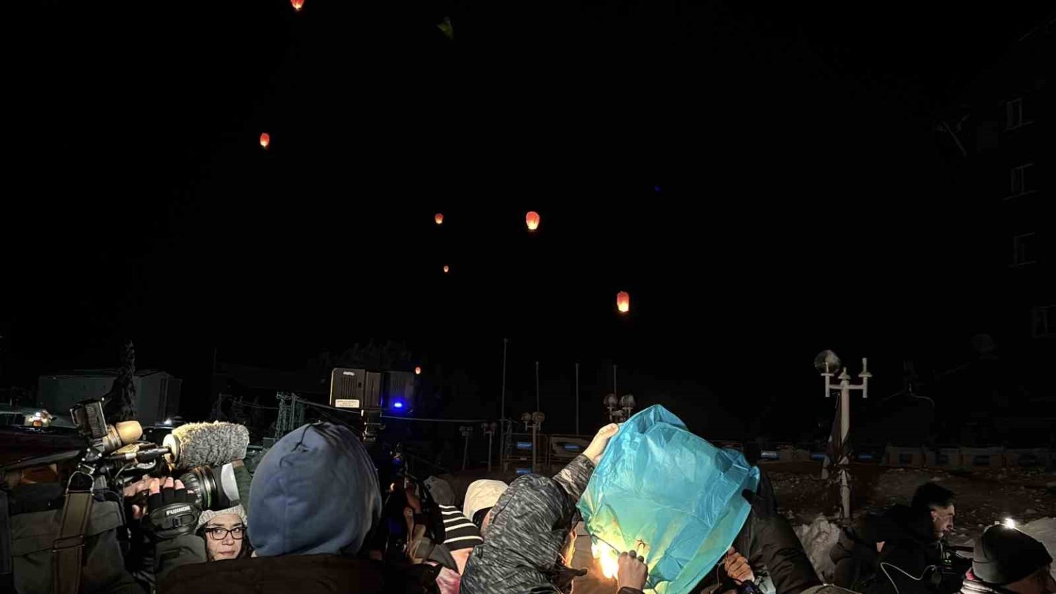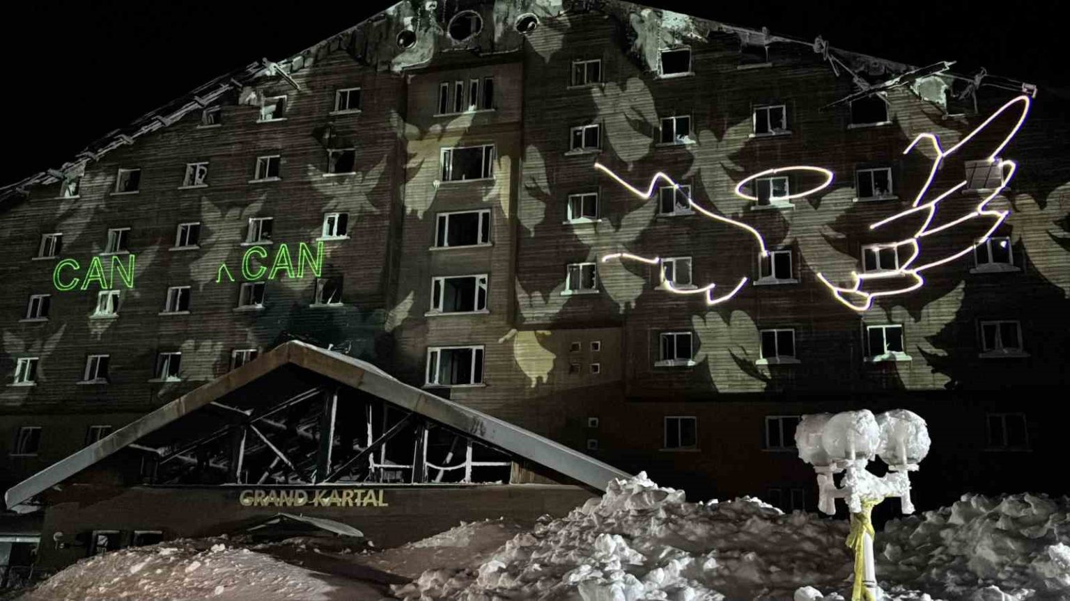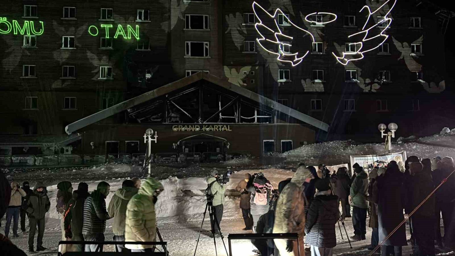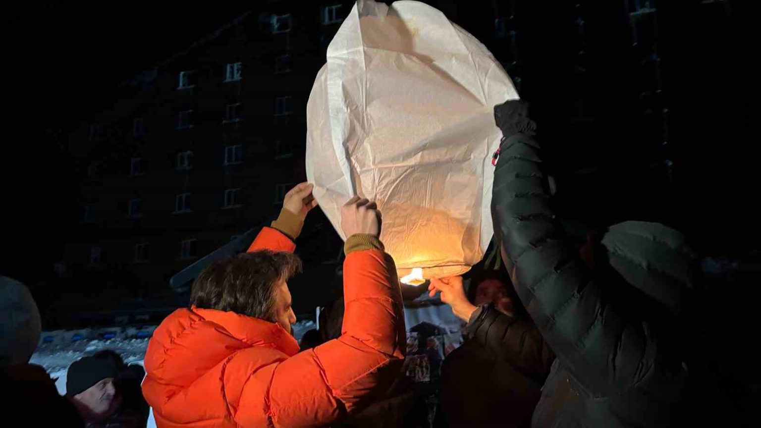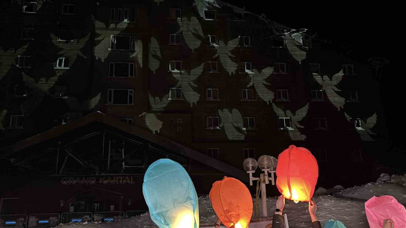 Gece yarısı hava sıcaklığının sıfırın altına düştüğü Kartalkaya’da, aileler saatler 03.17’yi gösterdiğinde otel binasının önünde toplandı. Duygusal anların yaşandığı anmada, hayatını kaybedenlerin isimleri ve onları temsilen ‘Melek’ sembolleri projeksiyonla otelin duvarına yansıtıldı. Aileler, kaybettikleri çocukları, eşleri ve kardeşleri için gökyüzüne dilek fenerleri bıraktı.